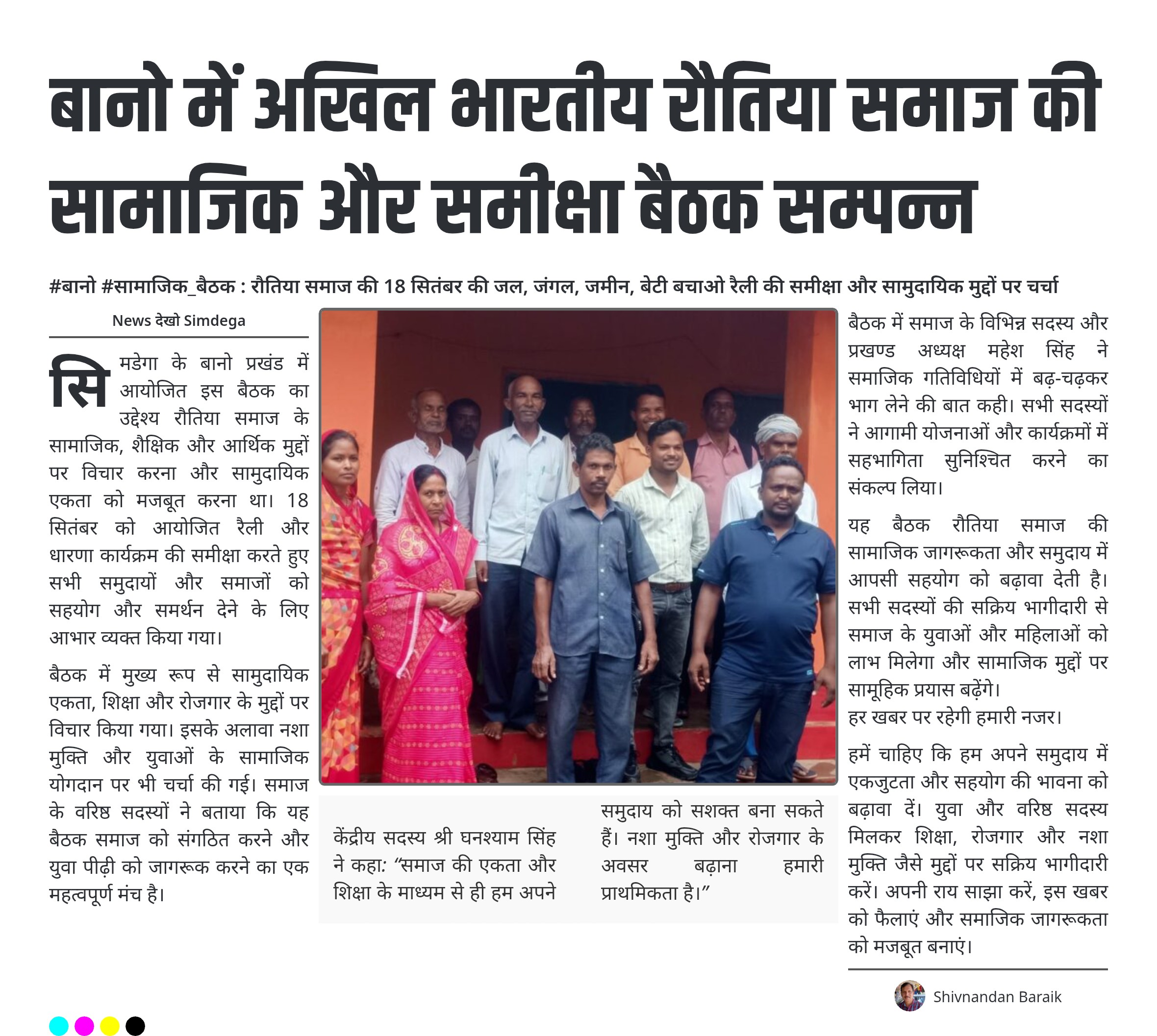 #बानो #सामाजिक_बैठक : रौतिया समाज की 18 सितंबर की जल, जंगल, जमीन, बेटी बचाओ रैली की समीक्षा और सामुदायिक मुद्दों पर चर्चा अखिल भारतीय रौतिया समाज की सामाजिक बैठक बानो, सिमडेगा में आयोजित। बैठक में 18 सितंबर को आयोजित जल, जंगल, जमीन, बेटी बचाओ रैली के सफल आयोजन पर चर्चा। बैठक की अध्यक्षता श्री घनश्याम सिंह, केन्द्रीय सदस्य ने की। बैठक में समाज की एकता, शिक्षा, रोजगार और नशा मुक्ति पर विचार-विमर्श। उपस्थित समाजिक सदस्यों में कलेश्वरी देवी, राजा सिंह,…