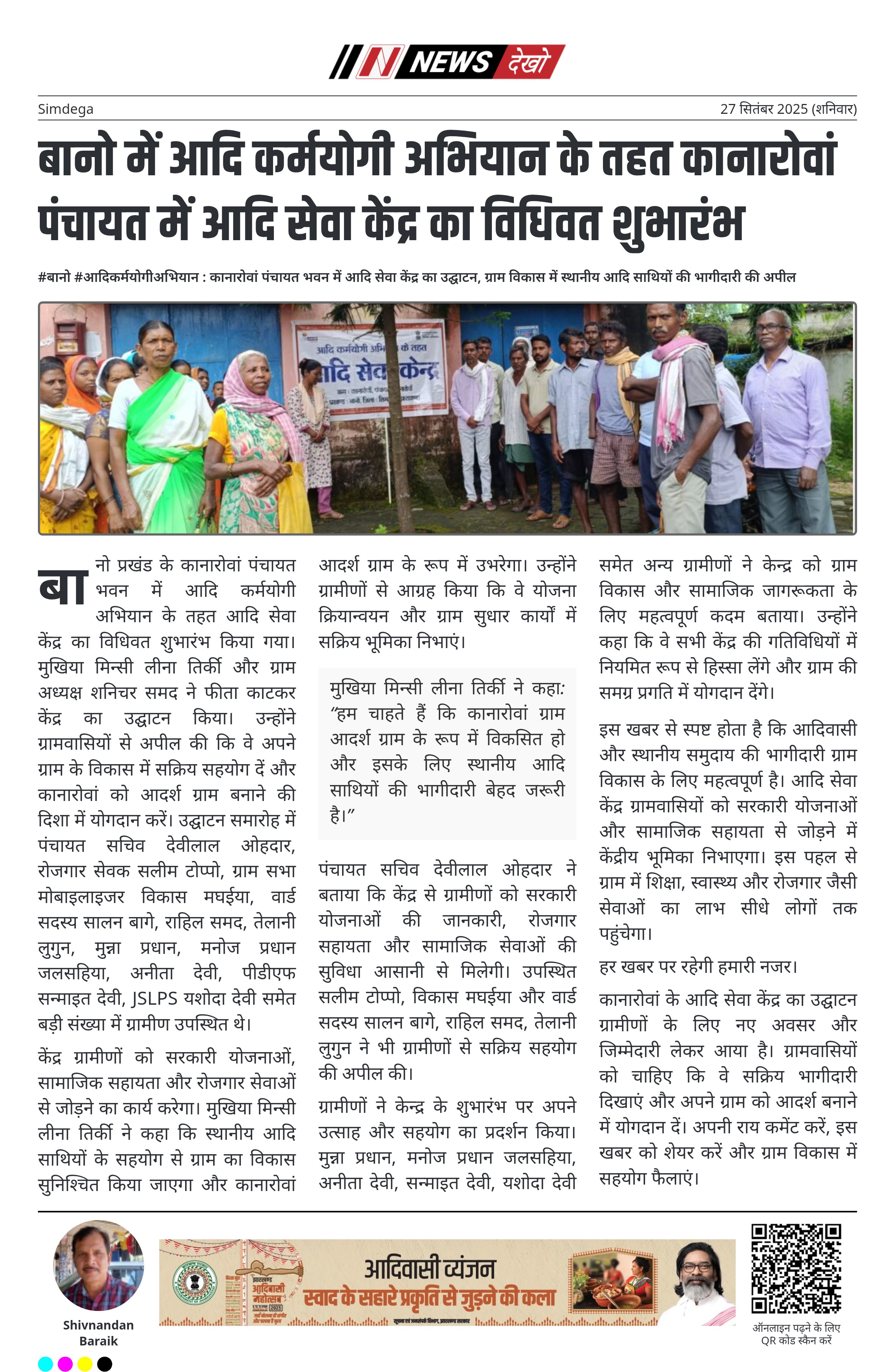#बानो #आदिकर्मयोगीअभियान : कानारोवां पंचायत भवन में आदि सेवा केंद्र का उद्घाटन, ग्राम विकास में स्थानीय आदि साथियों की भागीदारी की अपील मुखिया मिन्सी लीना तिर्की और ग्राम अध्यक्ष शनिचर समद ने फीता काटकर केंद्र का शुभारंभ किया। पंचायत सचिव देवीलाल ओहदार और रोजगार सेवक सलीम टोप्पो मौजूद रहे। ग्राम सभा मोबाइलाइजर विकास मघईया और वार्ड सदस्य सालन बागे, राहिल समद, तेलानी लुगुन उपस्थित थे। केंद्र का उद्देश्य ग्रामीणों को सरकारी योजनाओं और सामाजिक सेवाओं से जोड़ना। उपस्थित ग्रामीणों ने…
