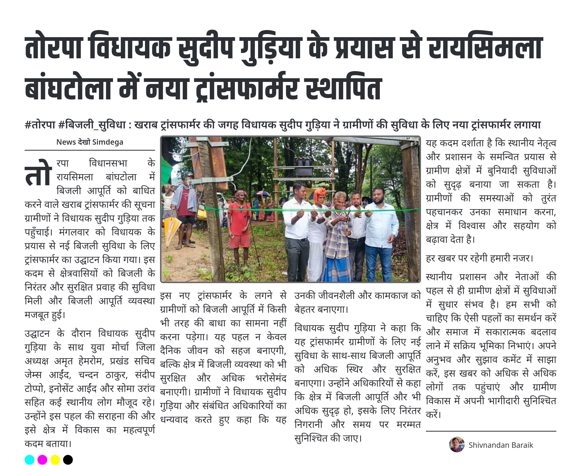 तोरपा विधायक सुदीप गुड़िया के प्रयास से रायसिमला बांघटोला में नया ट्रांसफार्मर स्थापित