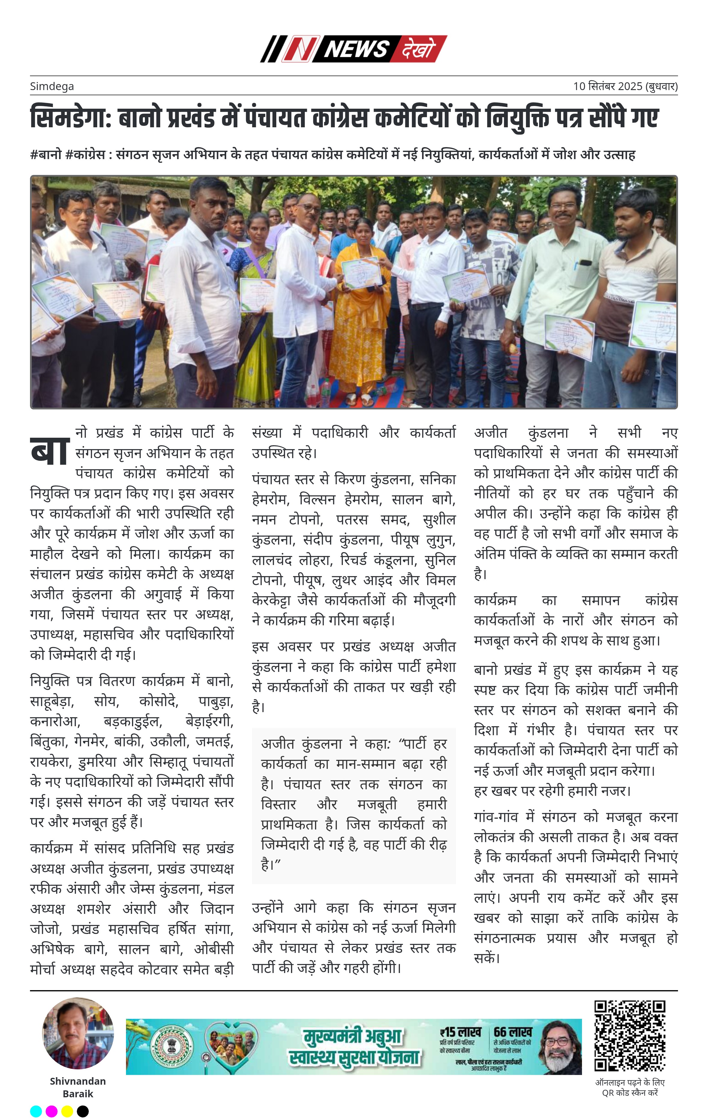 #बानो #कांग्रेस : संगठन सृजन अभियान के तहत पंचायत कांग्रेस कमेटियों में नई नियुक्तियां, कार्यकर्ताओं में जोश और उत्साह अजीत कुंडलना की अध्यक्षता में पंचायत कांग्रेस कमेटियों को नियुक्ति पत्र प्रदान। बानो, साहूबेड़ा, सोय, कोसोदे, पाबुड़ा समेत कई पंचायतों के अध्यक्ष, उपाध्यक्ष और पदाधिकारी बने। कार्यक्रम में सांसद प्रतिनिधि, प्रखंड उपाध्यक्ष, मंडल अध्यक्ष सहित अनेक पदाधिकारी मौजूद। युवा और अनुभवी कार्यकर्ताओं को जिम्मेदारी सौंप संगठन को नई ऊर्जा देने की पहल। कार्यकर्ताओं से जनता की समस्याओं को प्राथमिकता देने और…