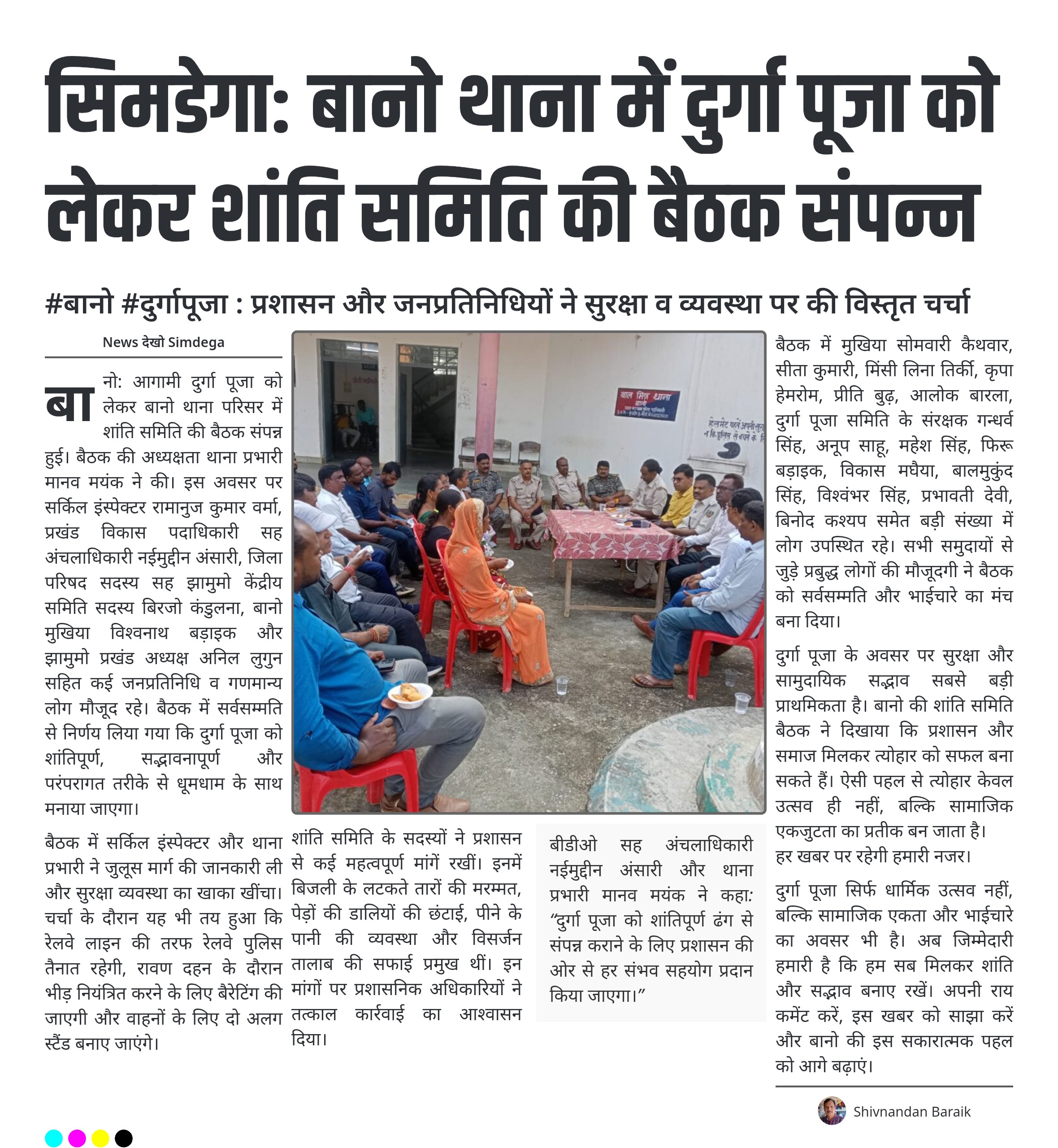 सिमडेगा: बानो थाना में दुर्गा पूजा को लेकर शांति समिति की बैठक संपन्न