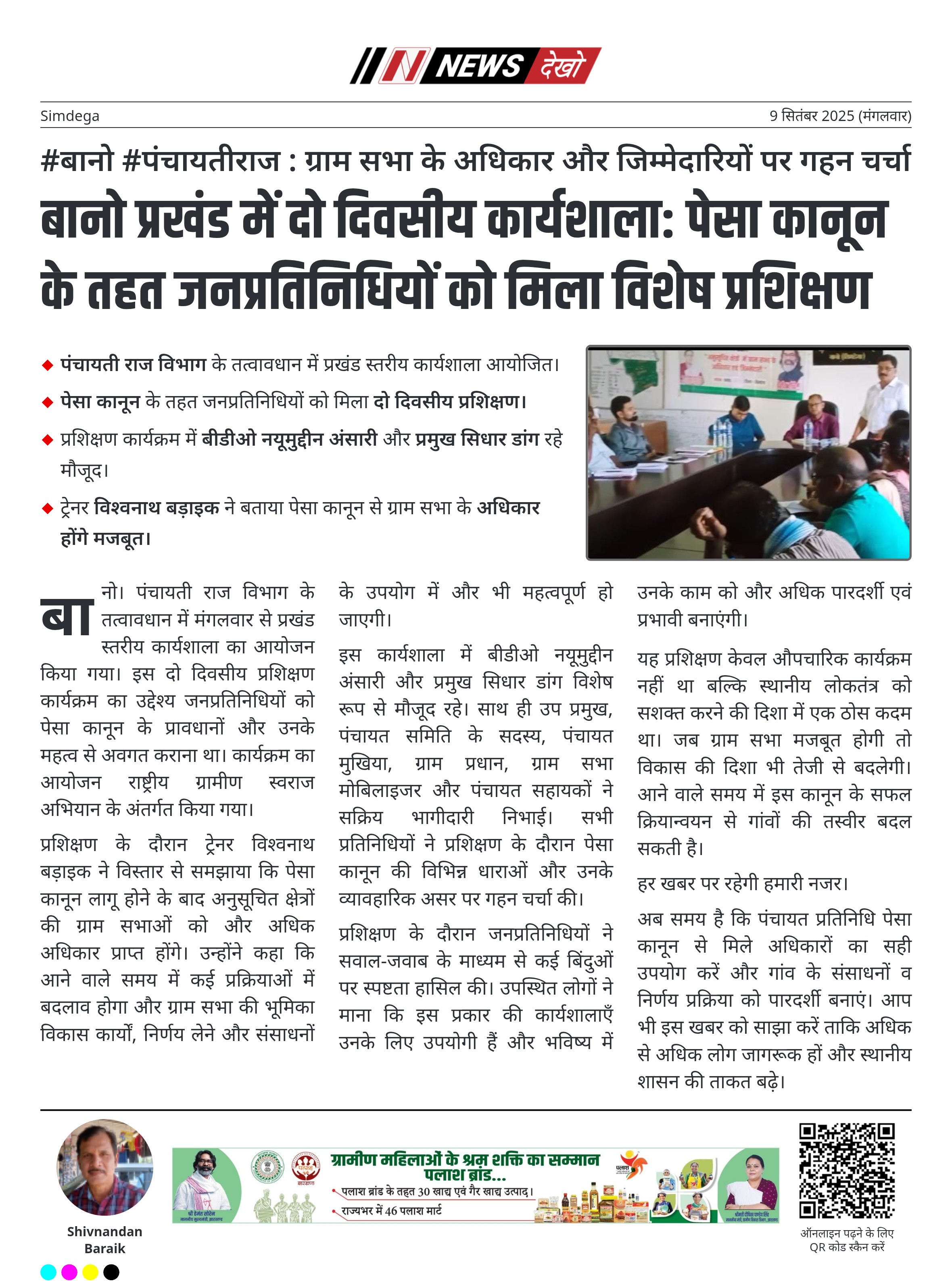 #बानो #पंचायतीराज : ग्राम सभा के अधिकार और जिम्मेदारियों पर गहन चर्चा पंचायती राज विभाग के तत्वावधान में प्रखंड स्तरीय कार्यशाला आयोजित। पेसा कानून के तहत जनप्रतिनिधियों को मिला दो दिवसीय प्रशिक्षण। प्रशिक्षण कार्यक्रम में बीडीओ नयूमुद्दीन अंसारी और प्रमुख सिधार डांग रहे मौजूद। ट्रेनर विश्वनाथ बड़ाइक ने बताया पेसा कानून से ग्राम सभा के अधिकार होंगे मजबूत। कार्यक्रम में उप प्रमुख, पंचायत समिति, मुखिया, ग्राम प्रधान और पंचायत सहायक रहे उपस्थित। बानो। पंचायती राज विभाग के तत्वावधान में मंगलवार…