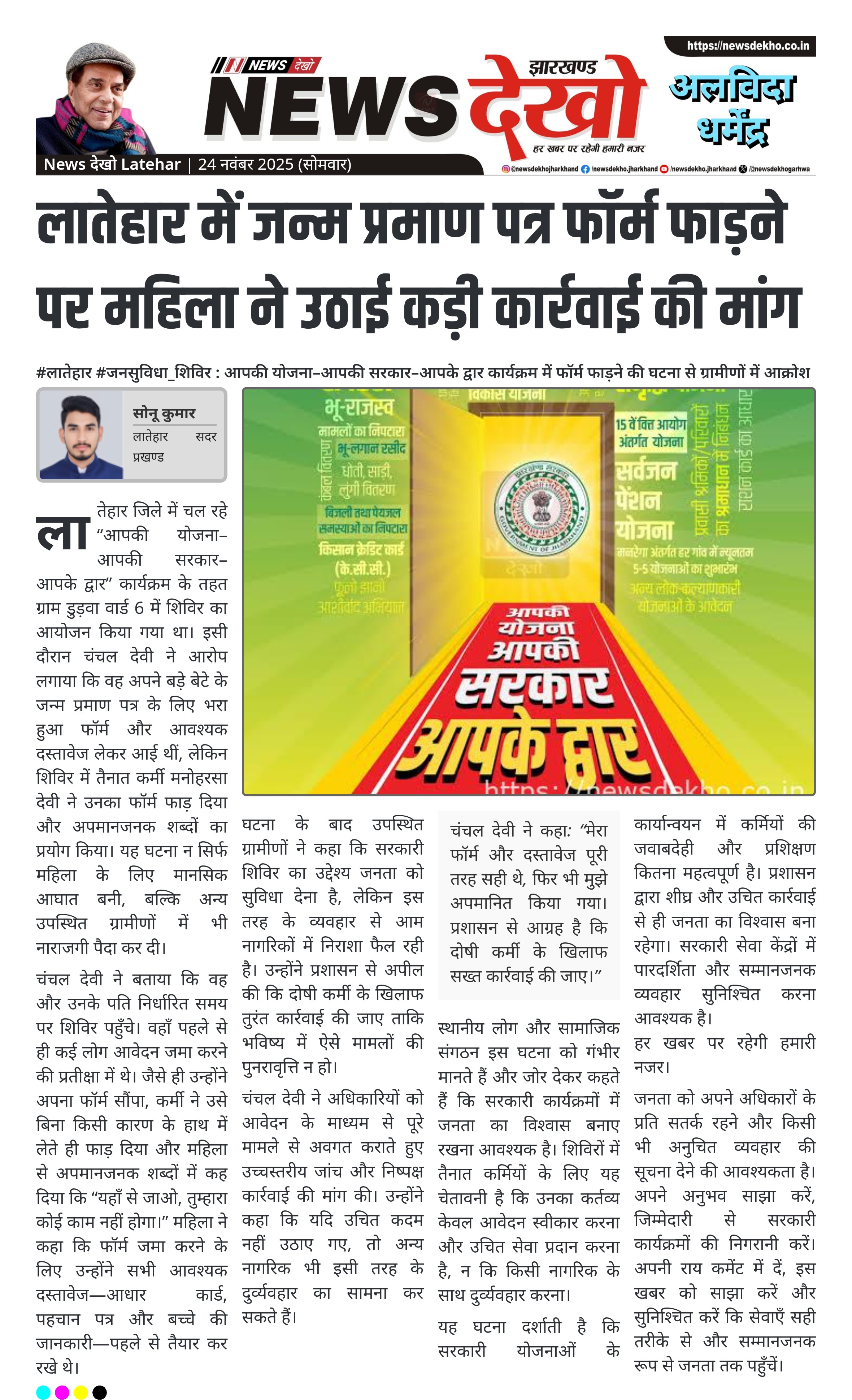 #लातेहार #जनसुविधा_शिविर : आपकी योजना–आपकी सरकार–आपके द्वार कार्यक्रम में फॉर्म फाड़ने की घटना से ग्रामीणों में आक्रोश घटना ग्राम डुड़वा, वार्ड 6 में हुई, जहां चंचल देवी के फॉर्म को फाड़ा गया। महिला ने आरोप लगाया कि शिविर कर्मी मनोहरसा देवी ने अपमानजनक व्यवहार किया। महिला ने उच्चस्तरीय जांच और दोषी पर कार्रवाई की मांग की। उपस्थित ग्रामीणों ने दुर्व्यवहार की निंदा की और प्रशासन से त्वरित कदम उठाने की अपील की। महिला के पास सभी आवश्यक दस्तावेज—आधार, पहचान पत्र,…