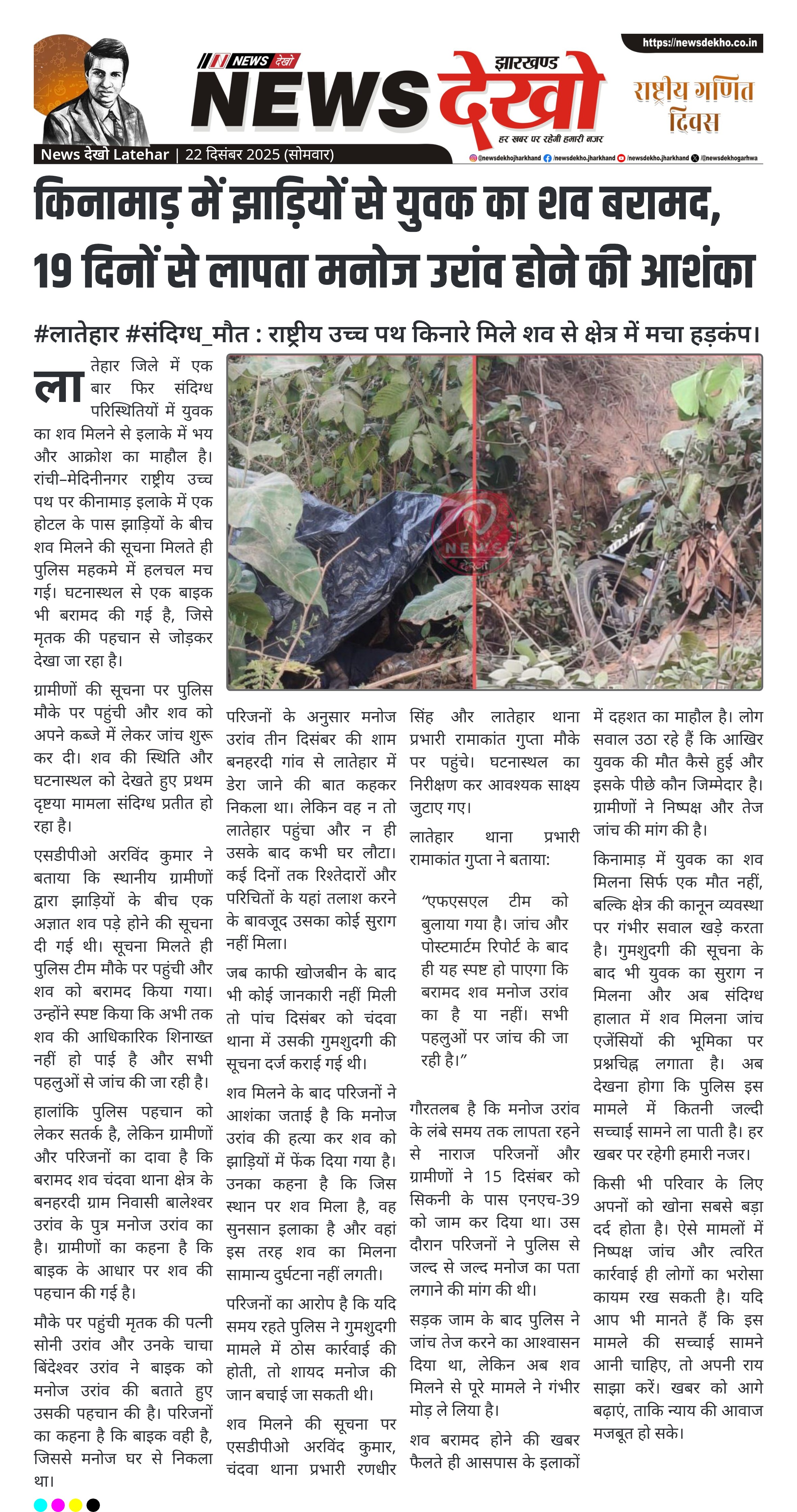 #लातेहार #संदिग्ध_मौत : राष्ट्रीय उच्च पथ किनारे मिले शव से क्षेत्र में मचा हड़कंप। किनामाड़ इलाके में एनएच किनारे झाड़ियों से युवक का शव बरामद। मौके से एक बाइक भी मिली, जिससे पहचान की कोशिश। शव को चंदवा थाना क्षेत्र के मनोज उरांव से जोड़ रहे ग्रामीण। तीन दिसंबर से था युवक लापता, पांच दिसंबर को दी गई थी सूचना। एफएसएल टीम को बुलाकर जांच शुरू, हत्या की आशंका। लातेहार जिले में एक बार फिर संदिग्ध परिस्थितियों में युवक का…