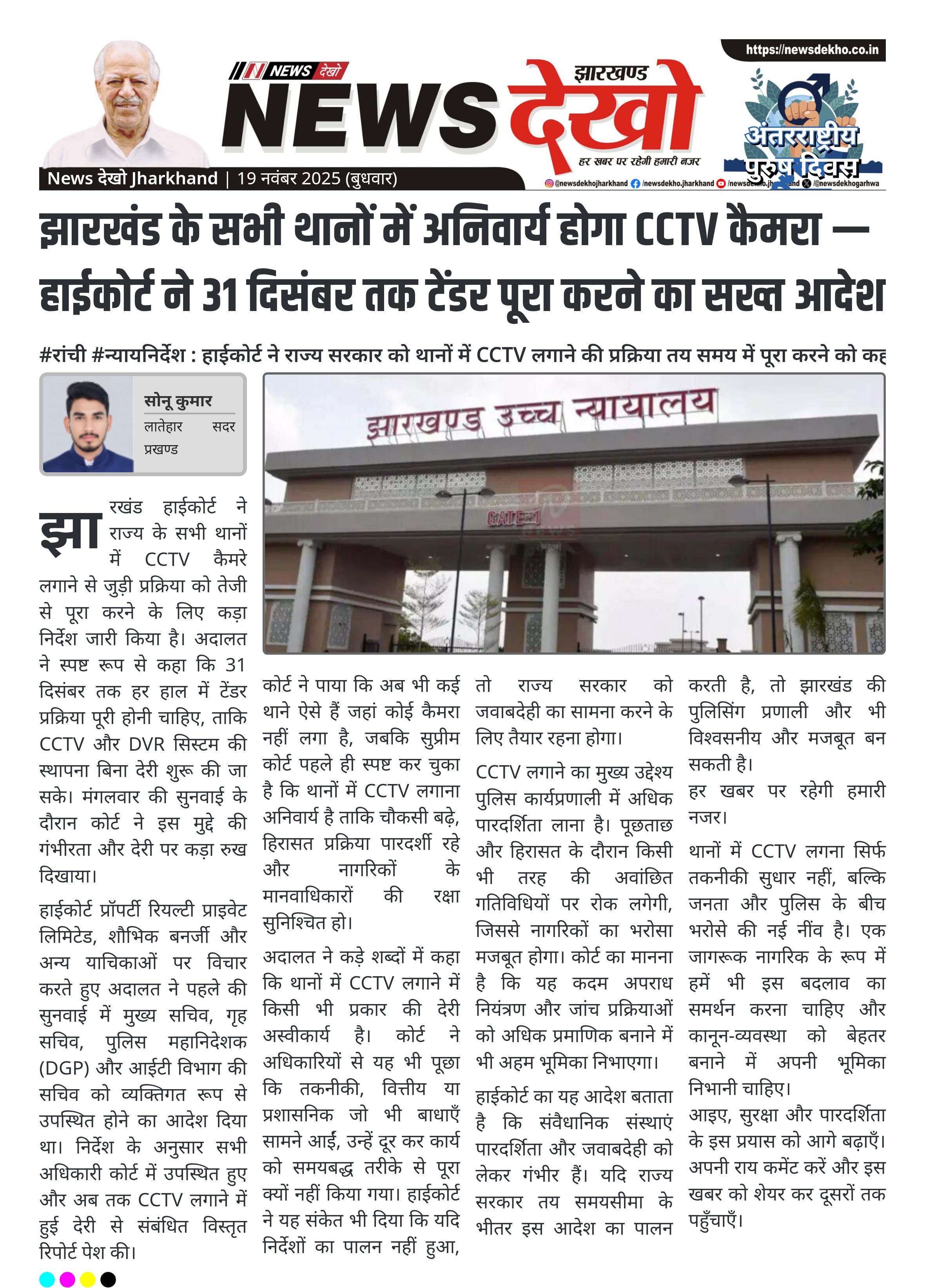 #रांची #न्यायनिर्देश : हाईकोर्ट ने राज्य सरकार को थानों में CCTV लगाने की प्रक्रिया तय समय में पूरा करने को कहा झारखंड हाईकोर्ट ने सभी थानों में CCTV कैमरे लगाने का निर्देश दिया। 31 दिसंबर तक पूरी टेंडर प्रक्रिया समाप्त करने का आदेश। मुख्य सचिव, गृह सचिव, DGP और आईटी सचिव कोर्ट में उपस्थित हुए। कई थानों में अब भी CCTV नहीं, कोर्ट ने देरी को अस्वीकार्य कहा। CCTV से पारदर्शिता, मानवाधिकार संरक्षण और अपराध नियंत्रण में मदद की उम्मीद।…