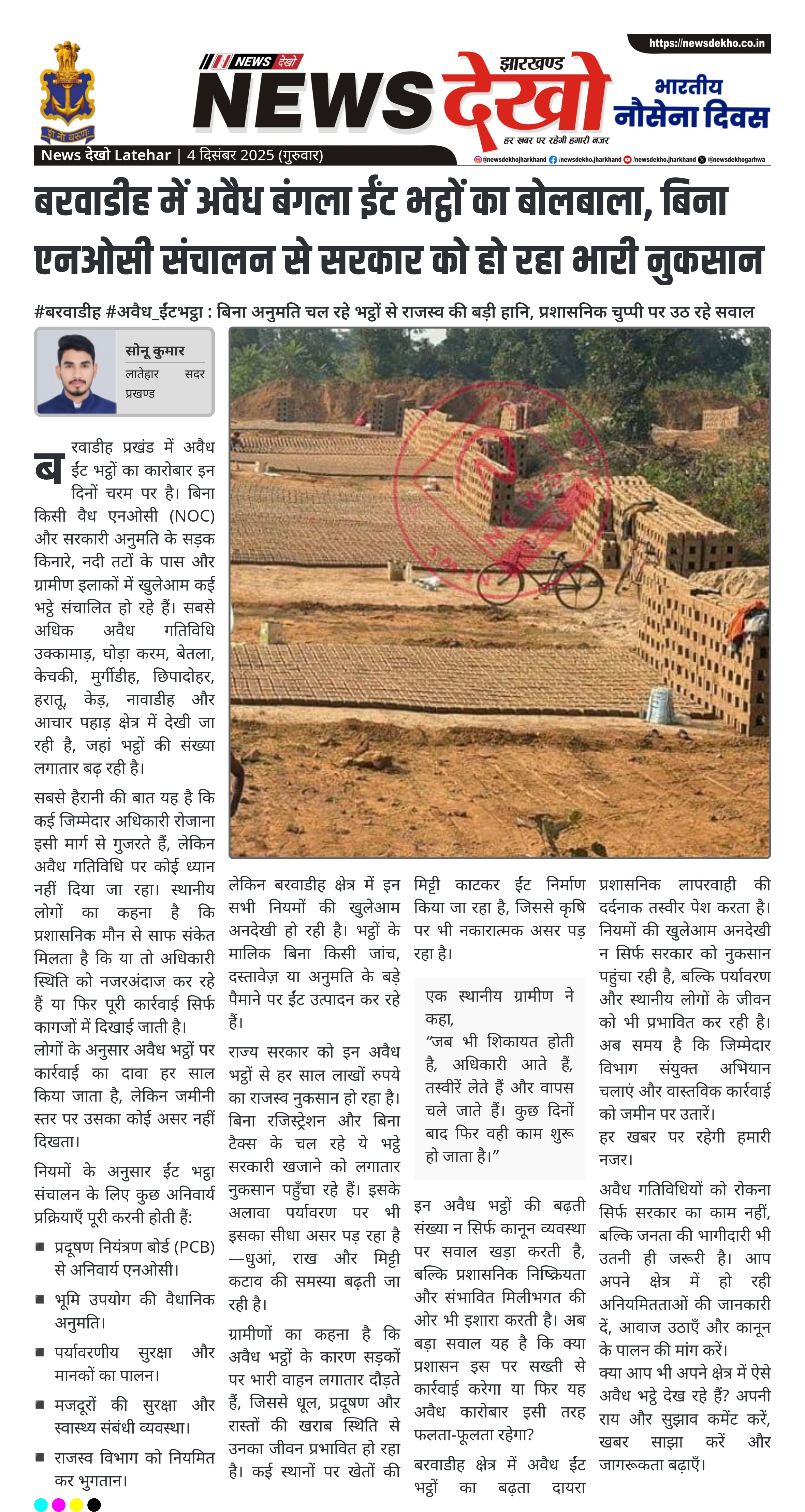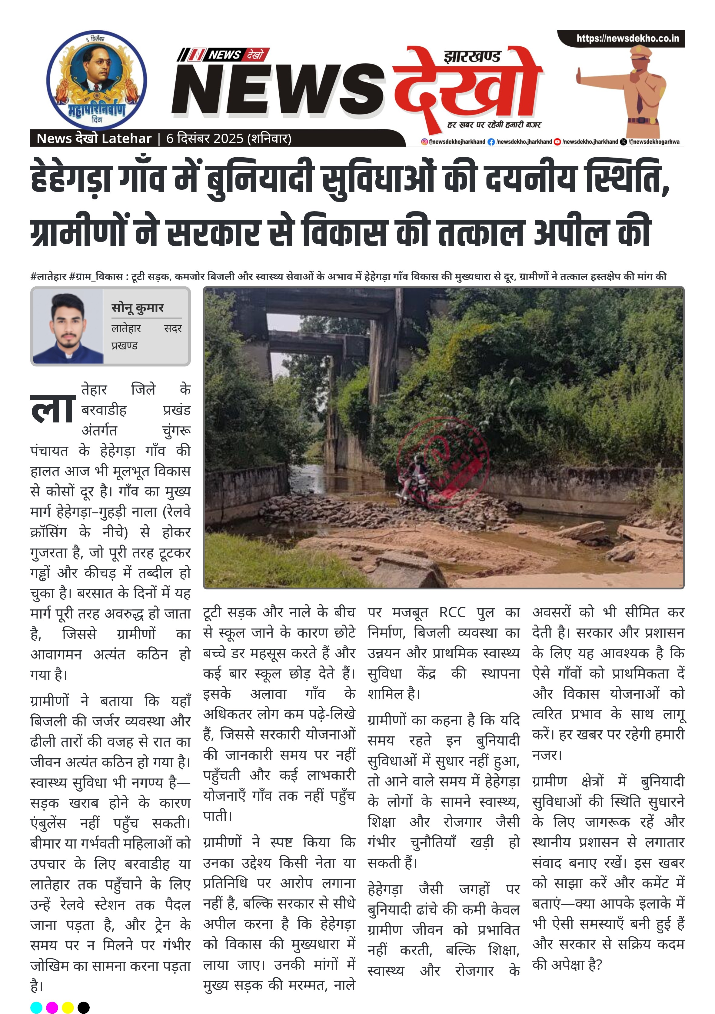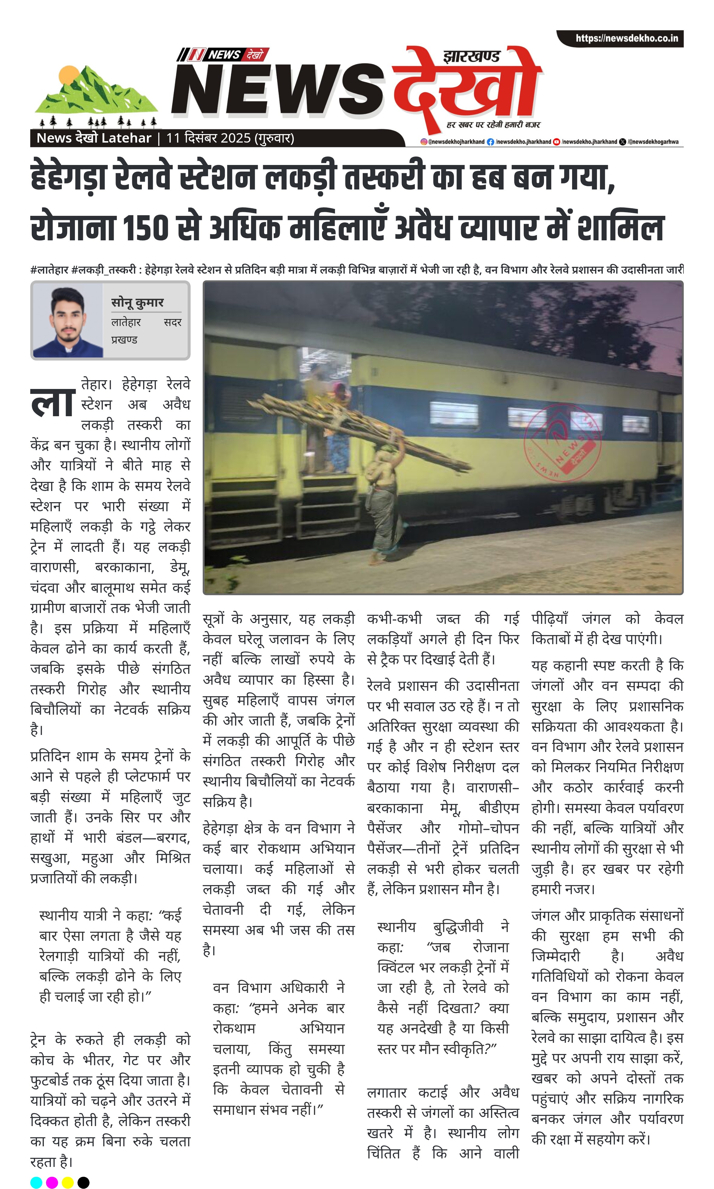 #लातेहार #लकड़ी_तस्करी : हेहेगड़ा रेलवे स्टेशन से प्रतिदिन बड़ी मात्रा में लकड़ी विभिन्न बाज़ारों में भेजी जा रही है, वन विभाग और रेलवे प्रशासन की उदासीनता जारी हेहेगड़ा रेलवे स्टेशन, धनबाद रेल मंडल के बरकाकाना–बरवाडीह रेलखंड पर अवैध लकड़ी तस्करी का केंद्र बन गया। प्रतिदिन 150 से अधिक महिलाएँ शाम की ट्रेनों में लकड़ी लादने में शामिल होती हैं। प्रमुख ट्रेनों में लकड़ी लादकर भेजी जाती है—वाराणसी–बरकाकाना मेमू (63558), बीडीएम पैसेंजर, गोमो–चोपन पैसेंजर (53344)। लकड़ी केवल ढोने वाली महिलाओं के…