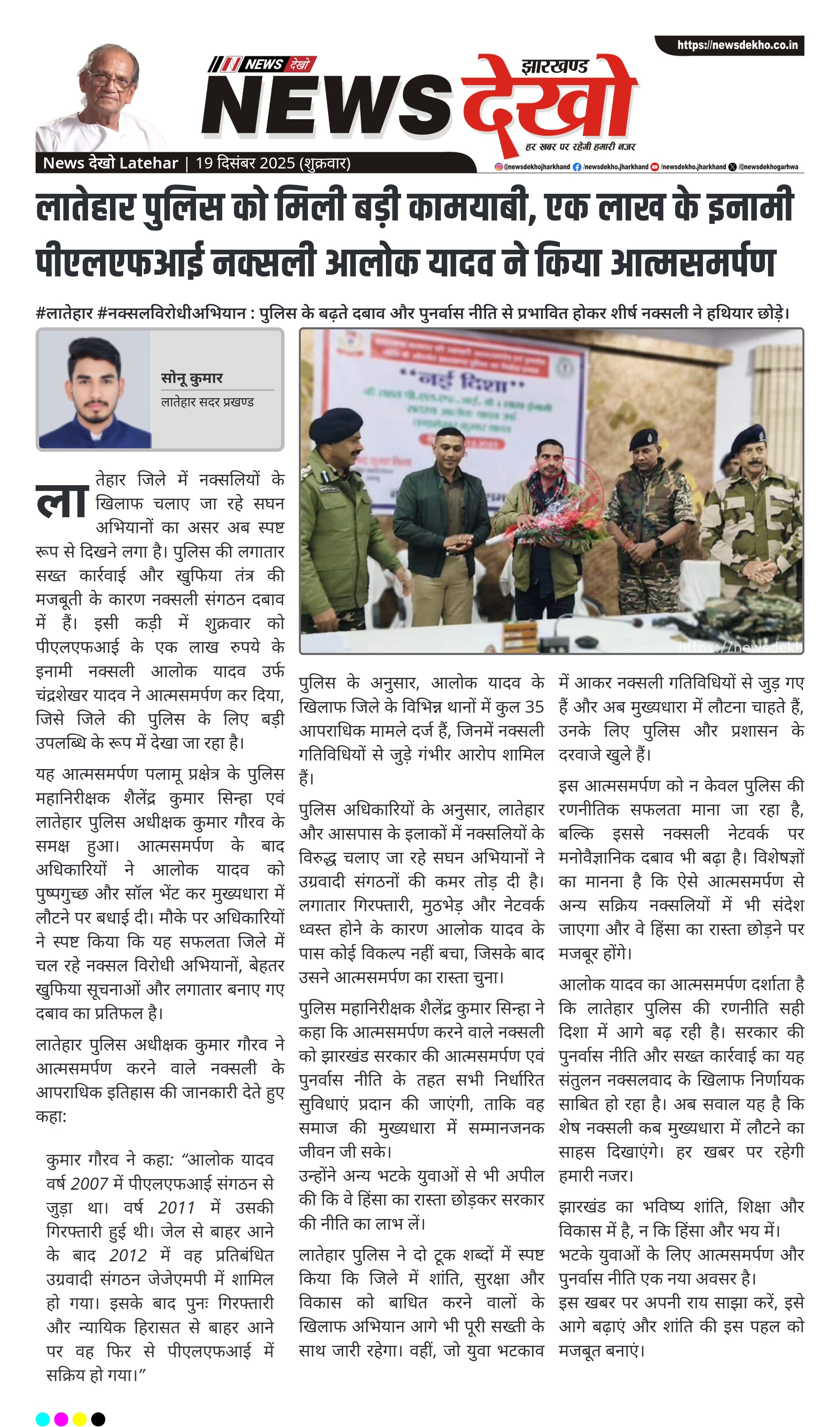 लातेहार पुलिस को मिली बड़ी कामयाबी, एक लाख के इनामी पीएलएफआई नक्सली आलोक यादव ने किया आत्मसमर्पण