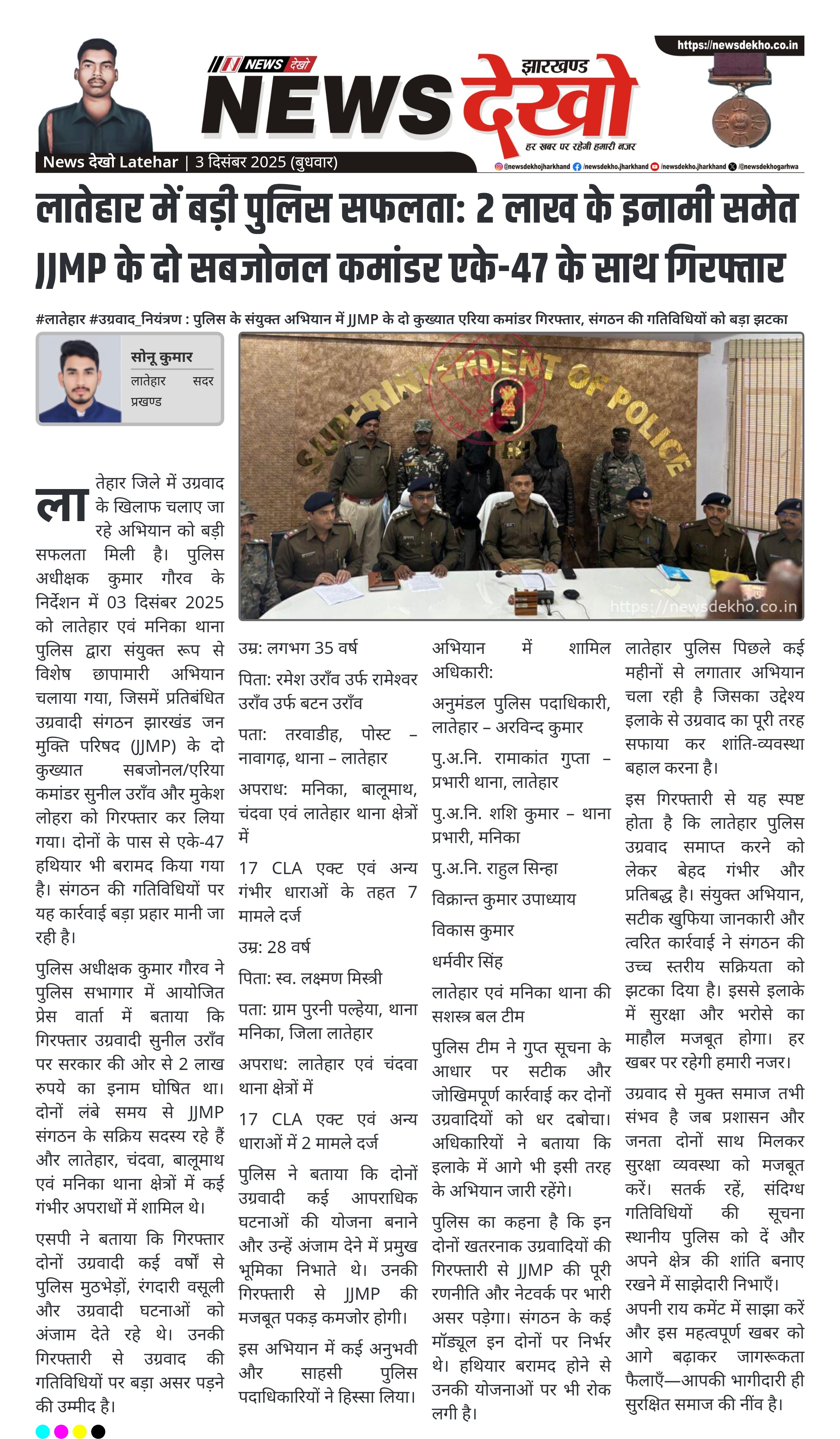 #लातेहार #उग्रवाद_नियंत्रण : पुलिस के संयुक्त अभियान में JJMP के दो कुख्यात एरिया कमांडर गिरफ्तार, संगठन की गतिविधियों को बड़ा झटका 2 लाख के इनामी उग्रवादी सुनील उराँव पुलिस के हत्थे चढ़ा। मुकेश लोहरा सहित दोनों JJMP के सक्रिय सबजोनल/एरिया कमांडर। पुलिस ने कार्रवाई में एके-47 हथियार समेत कई सामान बरामद किए। अभियान का नेतृत्व एसपी कुमार गौरव के निर्देशन में लातेहार-मनिका थाना पुलिस ने किया। गिरफ्तार दोनों उग्रवादियों पर सीएलए एक्ट सहित कई गंभीर मामले दर्ज। लातेहार जिले में…