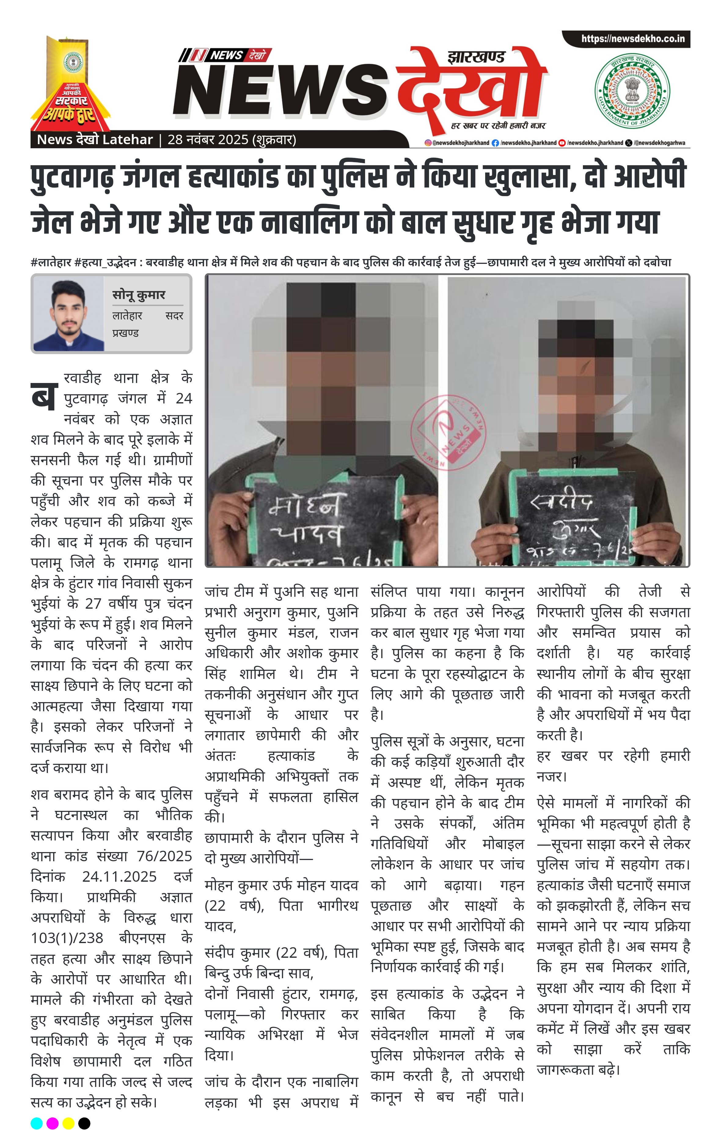 #लातेहार #हत्या_उद्भेदन : बरवाडीह थाना क्षेत्र में मिले शव की पहचान के बाद पुलिस की कार्रवाई तेज हुई—छापामारी दल ने मुख्य आरोपियों को दबोचा 24 नवंबर को पुटवागढ़ जंगल से मिले अज्ञात शव की पहचान चंदन भुईयां (27 वर्ष) के रूप में हुई। परिजनों ने हत्या कर आत्महत्या का रूप देने का गंभीर आरोप लगाया था। बरवाडीह थाना कांड संख्या 76/2025 दर्ज कर SDPO बरवाडीह के नेतृत्व में विशेष टीम का गठन। छापामारी दल ने मोहन कुमार उर्फ मोहन यादव…