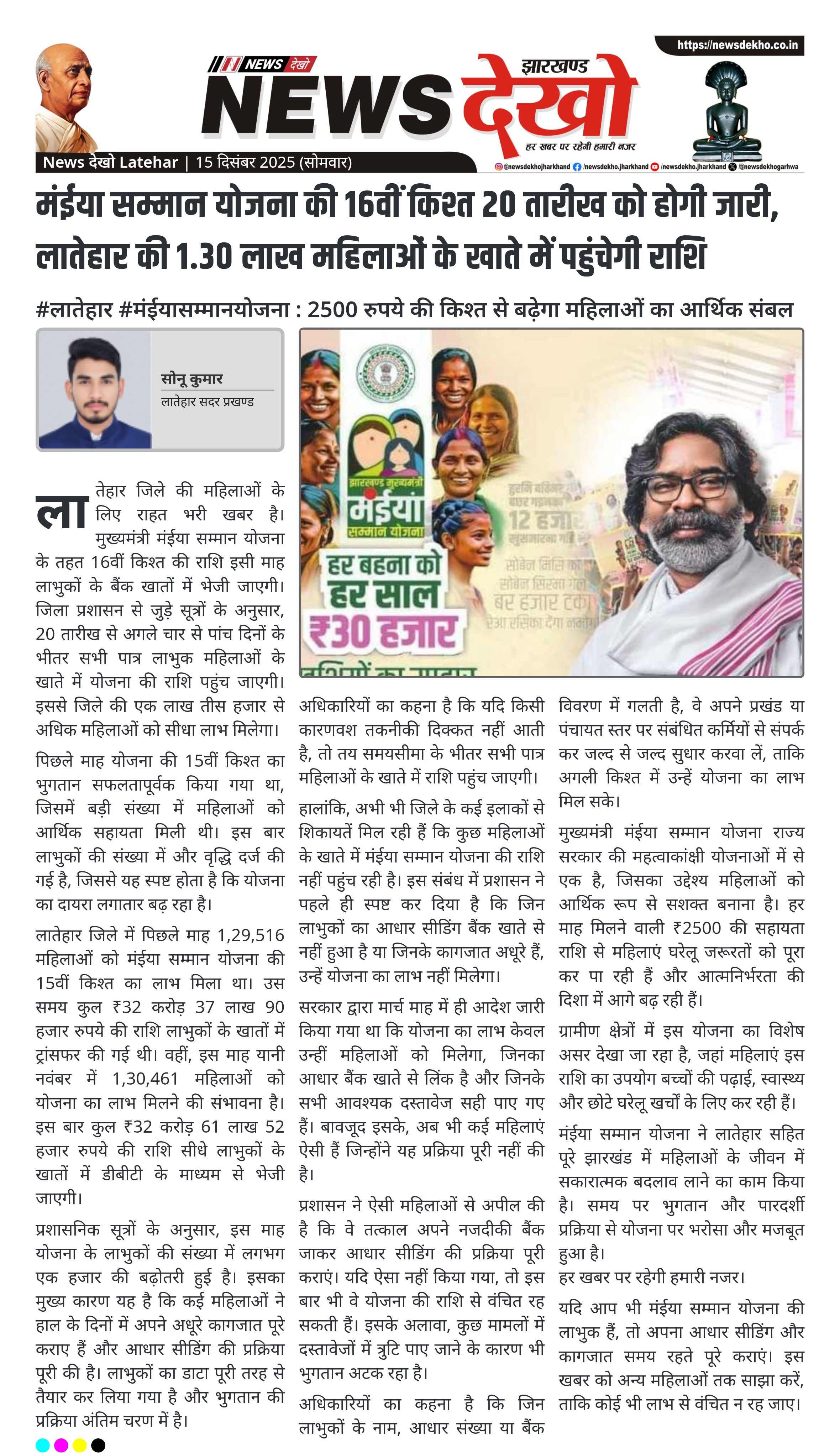 #लातेहार #मंईयासम्मानयोजना : 2500 रुपये की किश्त से बढ़ेगा महिलाओं का आर्थिक संबल लातेहार जिले की 1,30,461 महिलाएं होंगी 16वीं किश्त की लाभुक। प्रत्येक लाभुक के खाते में ₹2500 की राशि भेजी जाएगी। 20 तारीख से अगले 4–5 दिनों में खातों में पहुंचेगी राशि। कुल ₹32 करोड़ 61 लाख 52 हजार रुपये का होगा भुगतान। आधार सीडिंग और कागजात पूर्ण न होने पर लाभ से वंचित रहेंगी महिलाएं। लातेहार जिले की महिलाओं के लिए राहत भरी खबर है। मुख्यमंत्री मंईया…