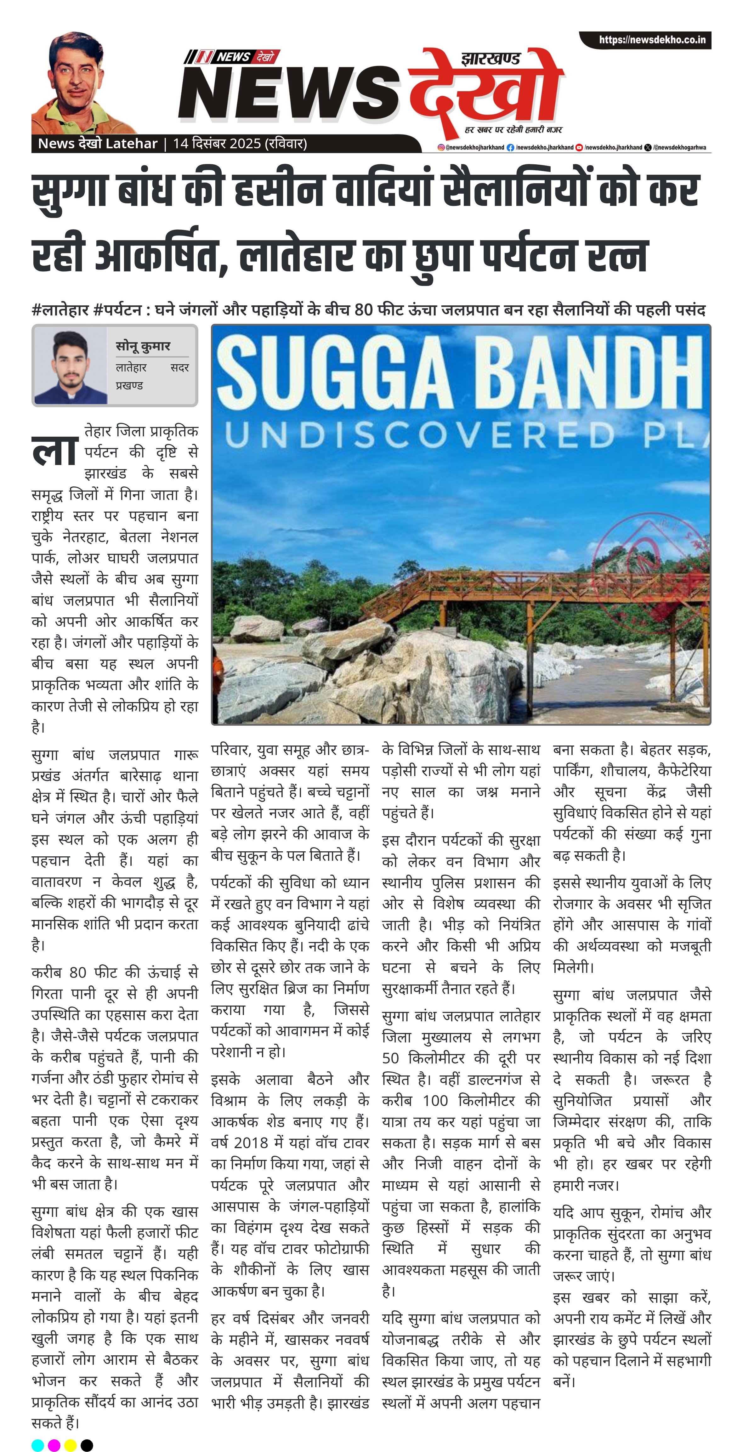 #लातेहार #पर्यटन : घने जंगलों और पहाड़ियों के बीच 80 फीट ऊंचा जलप्रपात बन रहा सैलानियों की पहली पसंद सुग्गा बांध जलप्रपात गारू प्रखंड के बारेसाढ़ थाना क्षेत्र में स्थित। लगभग 80 फीट ऊंचाई से गिरता पानी बना रहा है मुख्य आकर्षण। हजारों फीट लंबी समतल चट्टानें, पिकनिक के लिए उपयुक्त स्थल। वन विभाग द्वारा ब्रिज, शेड और वॉच टावर का निर्माण। नववर्ष और सर्दियों में भारी संख्या में पर्यटकों की आमद। लातेहार जिला प्राकृतिक पर्यटन की दृष्टि से झारखंड…
