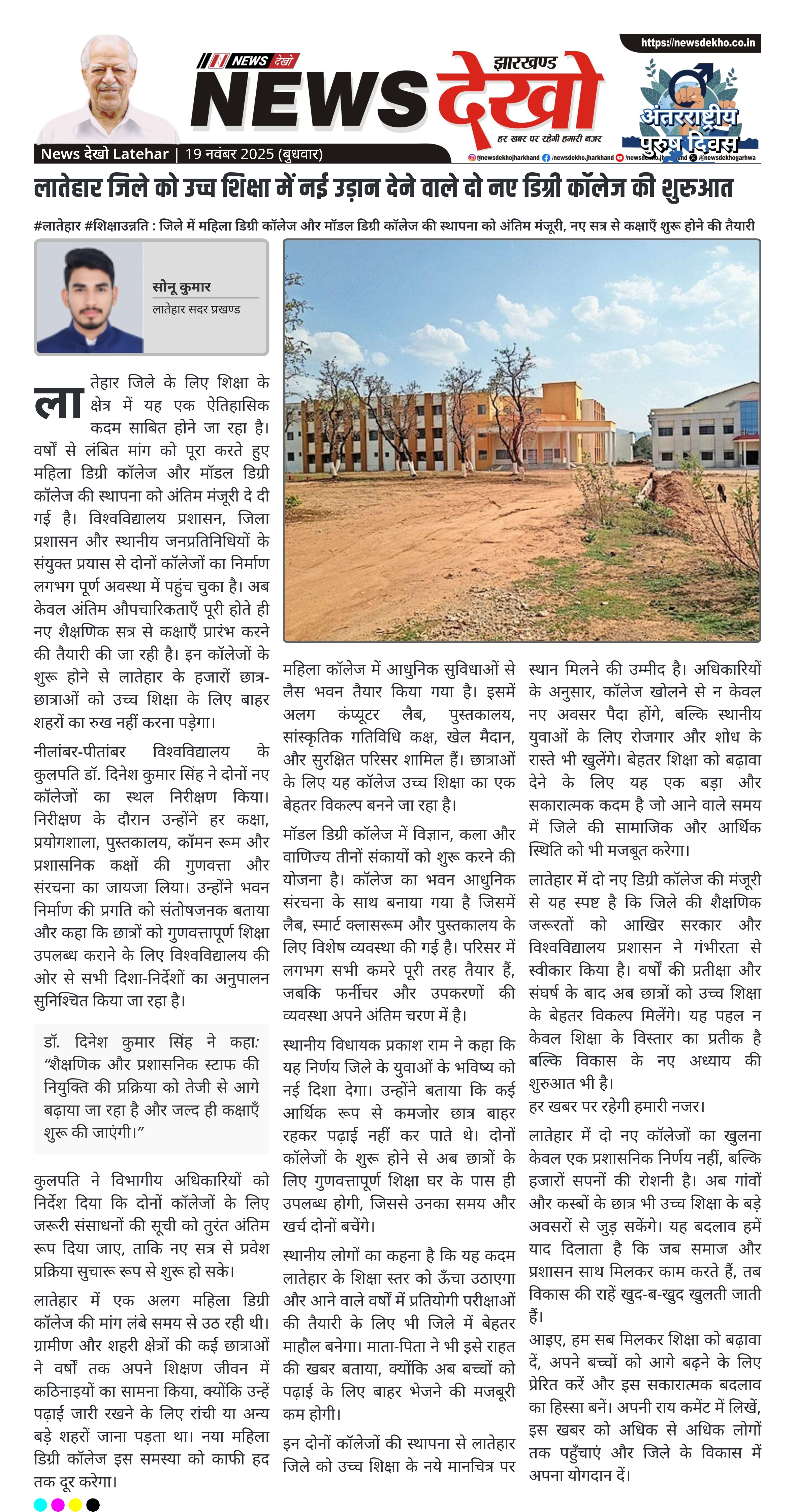 #लातेहार #शिक्षाउन्नति : जिले में महिला डिग्री कॉलेज और मॉडल डिग्री कॉलेज की स्थापना को अंतिम मंजूरी, नए सत्र से कक्षाएँ शुरू होने की तैयारी लातेहार में वर्षों से लंबित महिला डिग्री कॉलेज और मॉडल डिग्री कॉलेज को अंतिम मंजूरी मिल चुकी है। नीलांबर-पीतांबर विश्वविद्यालय के कुलपति डॉ. दिनेश कुमार सिंह ने दोनों कॉलेजों का विस्तृत निरीक्षण किया। भवन, प्रयोगशाला, पुस्तकालय और कक्षाओं का निर्माण लगभग पूरा, अंतिम चरण में फर्नीचर और उपकरण की व्यवस्था। स्थानीय विधायक प्रकाश राम ने…
