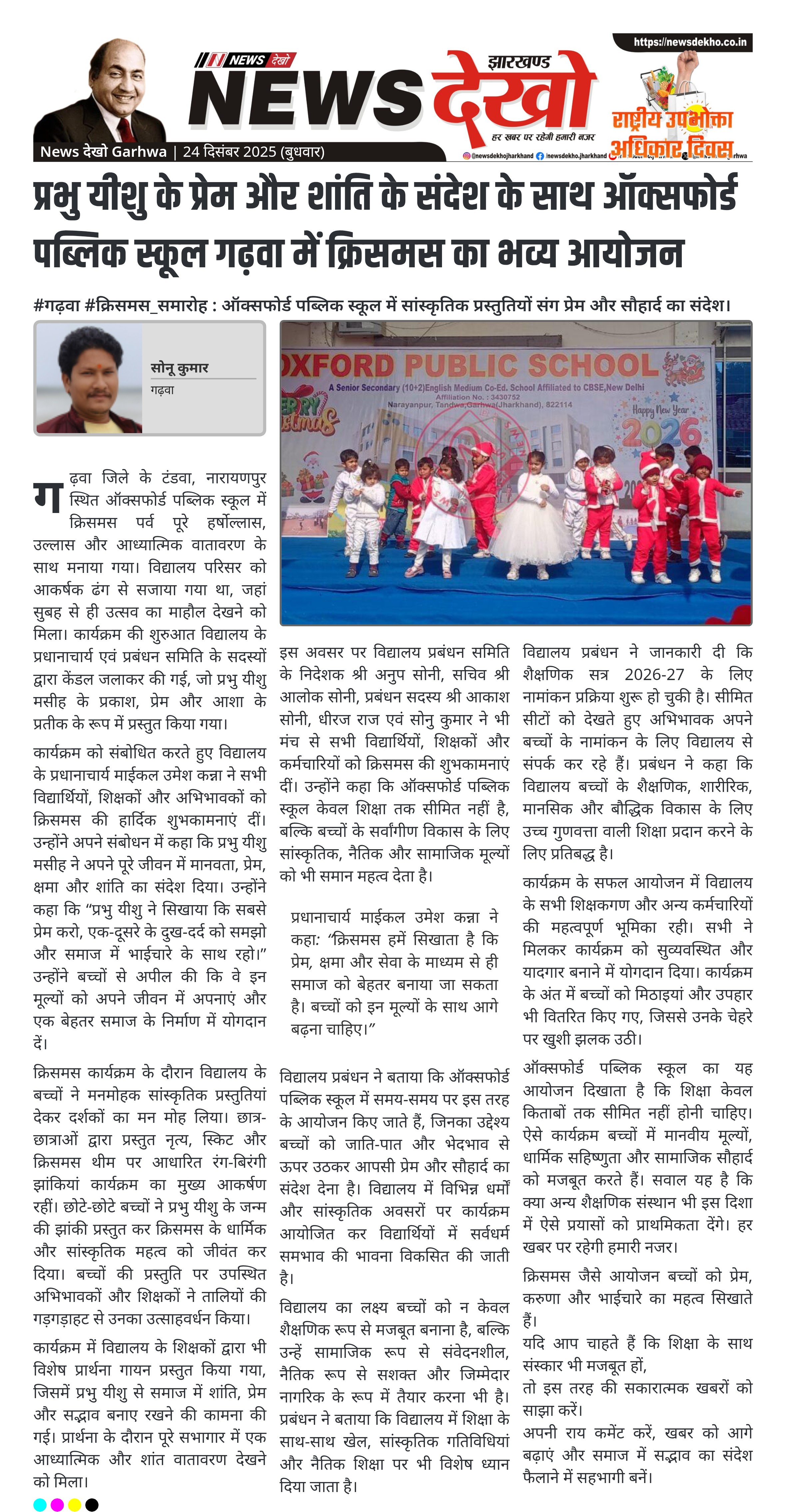 #गढ़वा #क्रिसमस_समारोह : ऑक्सफोर्ड पब्लिक स्कूल में सांस्कृतिक प्रस्तुतियों संग प्रेम और सौहार्द का संदेश। ऑक्सफोर्ड पब्लिक स्कूल, टंडवा नारायणपुर में क्रिसमस का भव्य आयोजन। प्रधानाचार्य माईकल उमेश कन्ना ने प्रेम और मानव कल्याण का संदेश दिया। बच्चों द्वारा नृत्य, स्किट और रंग-बिरंगी झांकियों की प्रस्तुति। प्रबंधन समिति के सदस्यों ने बच्चों व शिक्षकों को दी शुभकामनाएं। विद्यालय में सत्र 2026-27 के नामांकन प्रक्रिया शुरू। गढ़वा जिले के टंडवा, नारायणपुर स्थित ऑक्सफोर्ड पब्लिक स्कूल में क्रिसमस पर्व पूरे हर्षोल्लास, उल्लास…