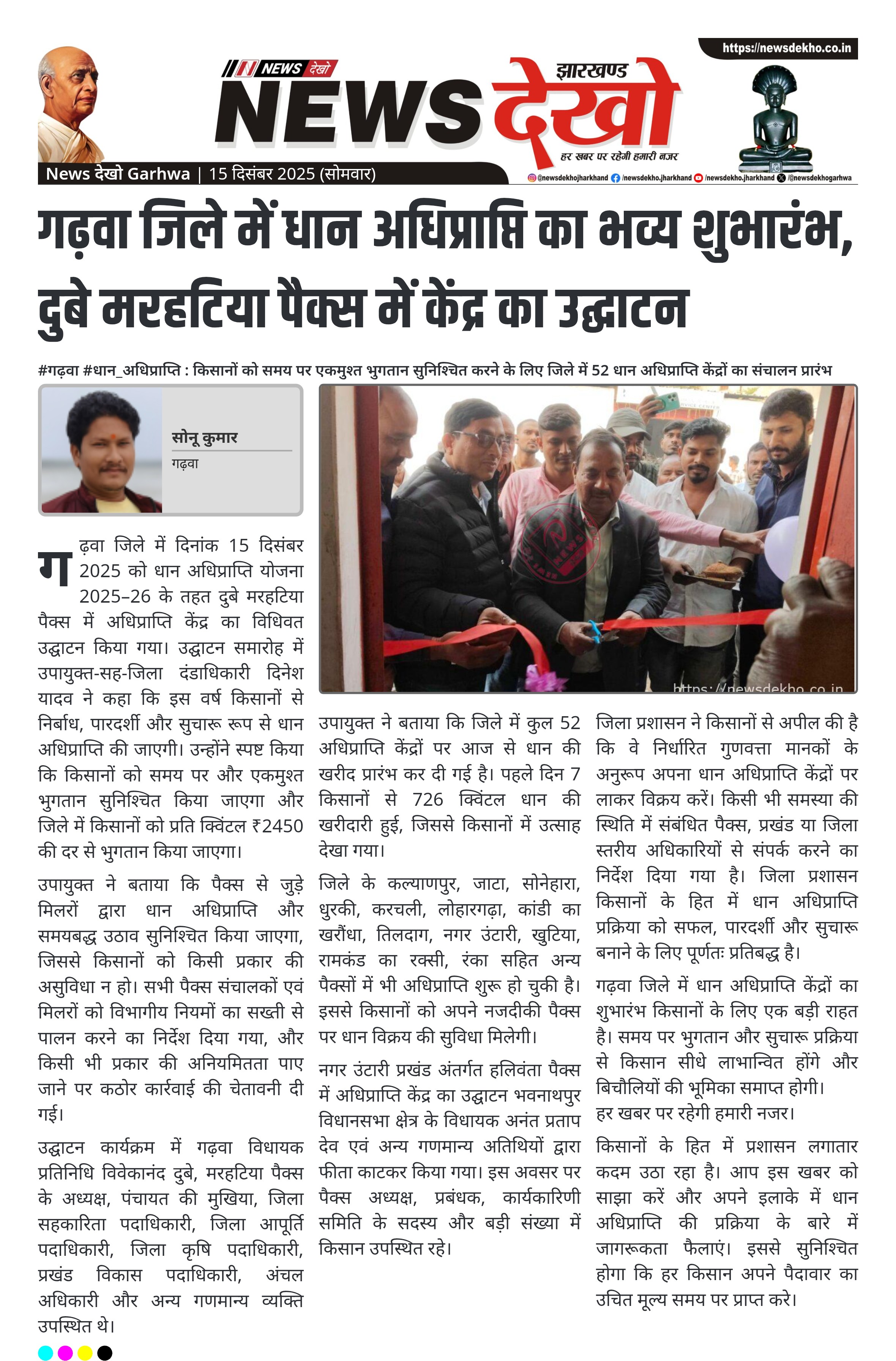 #गढ़वा #धान_अधिप्राप्ति : किसानों को समय पर एकमुश्त भुगतान सुनिश्चित करने के लिए जिले में 52 धान अधिप्राप्ति केंद्रों का संचालन प्रारंभ गढ़वा जिले के दुबे मरहटिया पैक्स में धान अधिप्राप्ति केंद्र का विधिवत उद्घाटन। उपायुक्त-सह-जिला दंडाधिकारी दिनेश यादव ने किसानों को समय पर एकमुश्त भुगतान का आश्वासन दिया। किसानों को ₹2450 प्रति क्विंटल की दर से धान का भुगतान सुनिश्चित। जिले में कुल 52 धान अधिप्राप्ति केंद्र चालू, पहले दिन 726 क्विंटल धान की खरीद। पैक्स संचालकों और मिलरों…