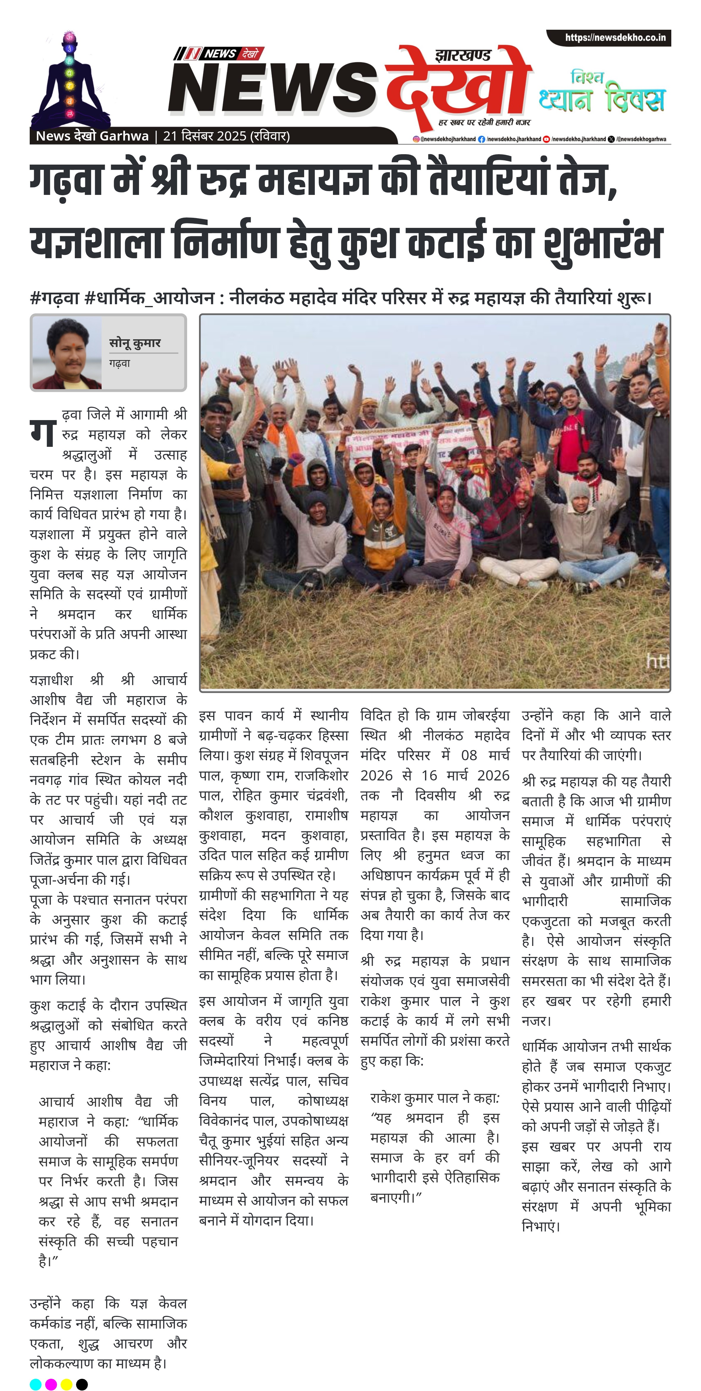 गढ़वा में श्री रुद्र महायज्ञ की तैयारियां तेज, यज्ञशाला निर्माण हेतु कुश कटाई का शुभारंभ