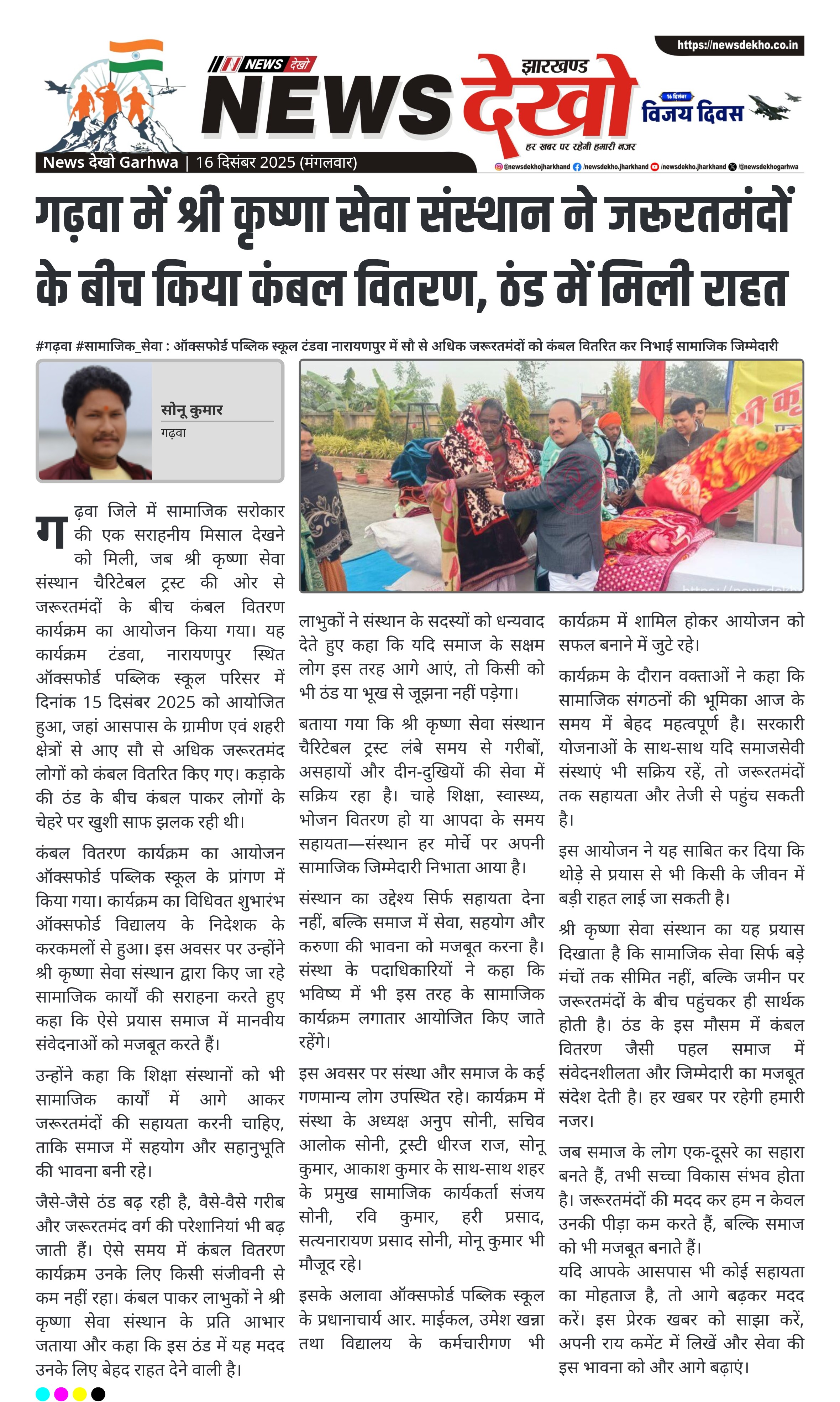 #गढ़वा #सामाजिक_सेवा : ऑक्सफोर्ड पब्लिक स्कूल टंडवा नारायणपुर में सौ से अधिक जरूरतमंदों को कंबल वितरित कर निभाई सामाजिक जिम्मेदारी श्री कृष्णा सेवा संस्थान चैरिटेबल ट्रस्ट द्वारा कंबल वितरण कार्यक्रम का आयोजन। टंडवा नारायणपुर स्थित ऑक्सफोर्ड पब्लिक स्कूल में हुआ कार्यक्रम। 100 से अधिक जरूरतमंदों को कंबल वितरित कर ठंड से राहत। कार्यक्रम का उद्घाटन ऑक्सफोर्ड विद्यालय के निदेशक के हाथों सम्पन्न। संस्था के पदाधिकारी, सामाजिक कार्यकर्ता और विद्यालय परिवार रहा मौजूद। गढ़वा जिले में सामाजिक सरोकार की एक सराहनीय…