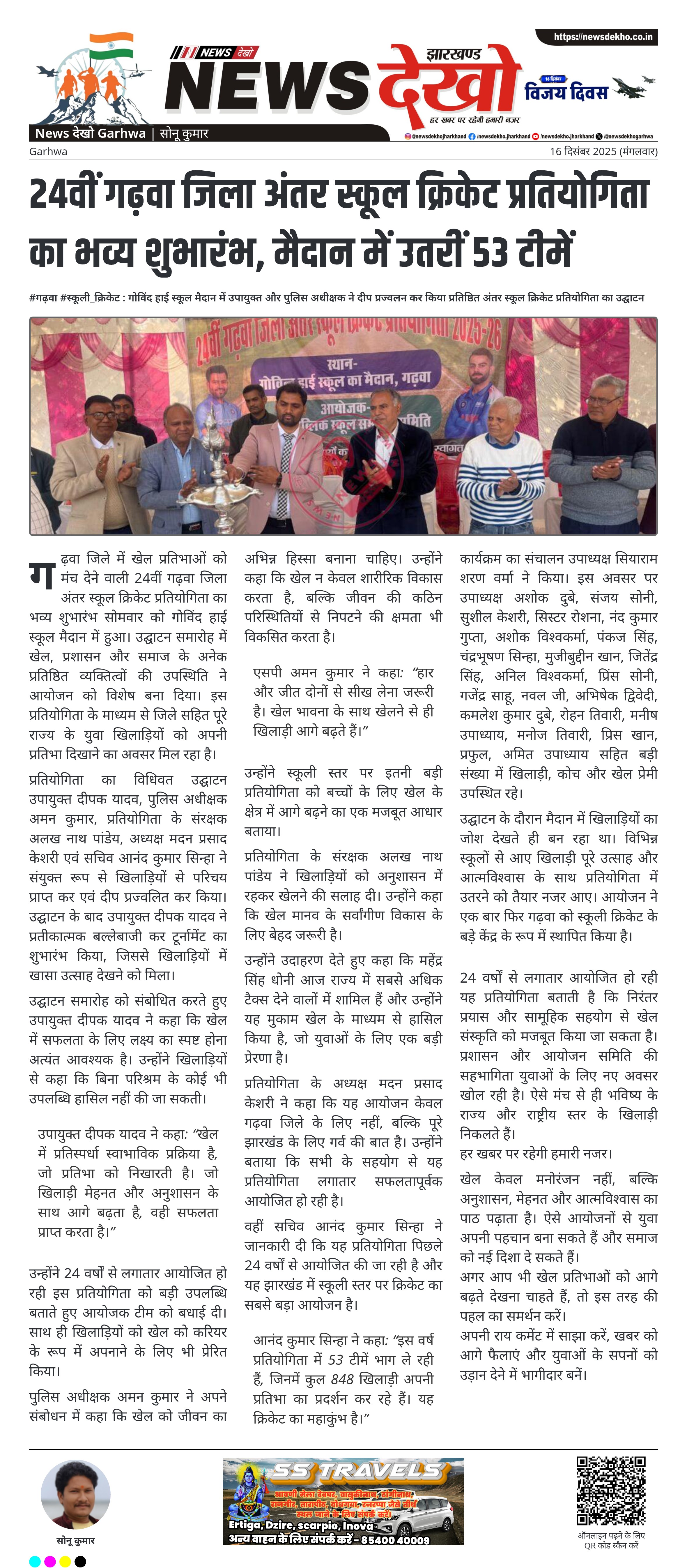 #गढ़वा #स्कूली_क्रिकेट : गोविंद हाई स्कूल मैदान में उपायुक्त और पुलिस अधीक्षक ने दीप प्रज्वलन कर किया प्रतिष्ठित अंतर स्कूल क्रिकेट प्रतियोगिता का उद्घाटन गोविंद हाई स्कूल मैदान, गढ़वा में 24वीं जिला अंतर स्कूल क्रिकेट प्रतियोगिता का आयोजन। उपायुक्त दीपक यादव ने प्रतीकात्मक बल्लेबाजी कर प्रतियोगिता का शुभारंभ किया। पुलिस अधीक्षक अमन कुमार सहित कई प्रशासनिक व खेल जगत के गणमान्य रहे उपस्थित। प्रतियोगिता में 53 टीमें और 848 खिलाड़ी ले रहे हैं भाग। आयोजकों ने इसे झारखंड का सबसे…