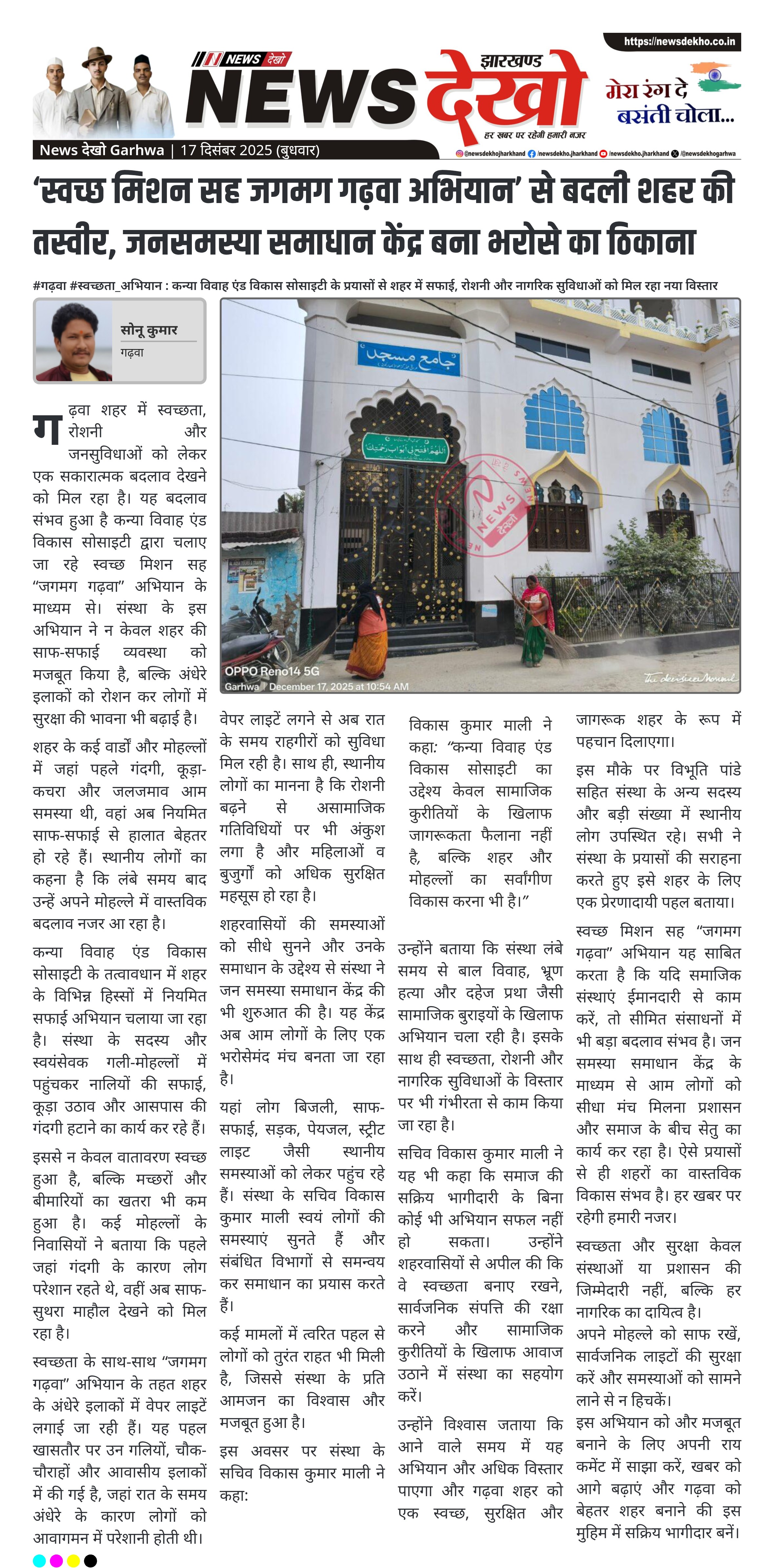 #गढ़वा #स्वच्छता_अभियान : कन्या विवाह एंड विकास सोसाइटी के प्रयासों से शहर में सफाई, रोशनी और नागरिक सुविधाओं को मिल रहा नया विस्तार कन्या विवाह एंड विकास सोसाइटी द्वारा संचालित स्वच्छ मिशन सह “जगमग गढ़वा” अभियान से शहर में व्यापक बदलाव। गली-मोहल्लों की नियमित साफ-सफाई और कूड़ा-कचरा हटाने से लोगों को राहत। अंधेरे इलाकों में वेपर लाइटें लगने से सुरक्षा और आवागमन में सुधार। शहरवासियों की समस्याओं के समाधान के लिए जन समस्या समाधान केंद्र की शुरुआत। संस्था के सचिव…