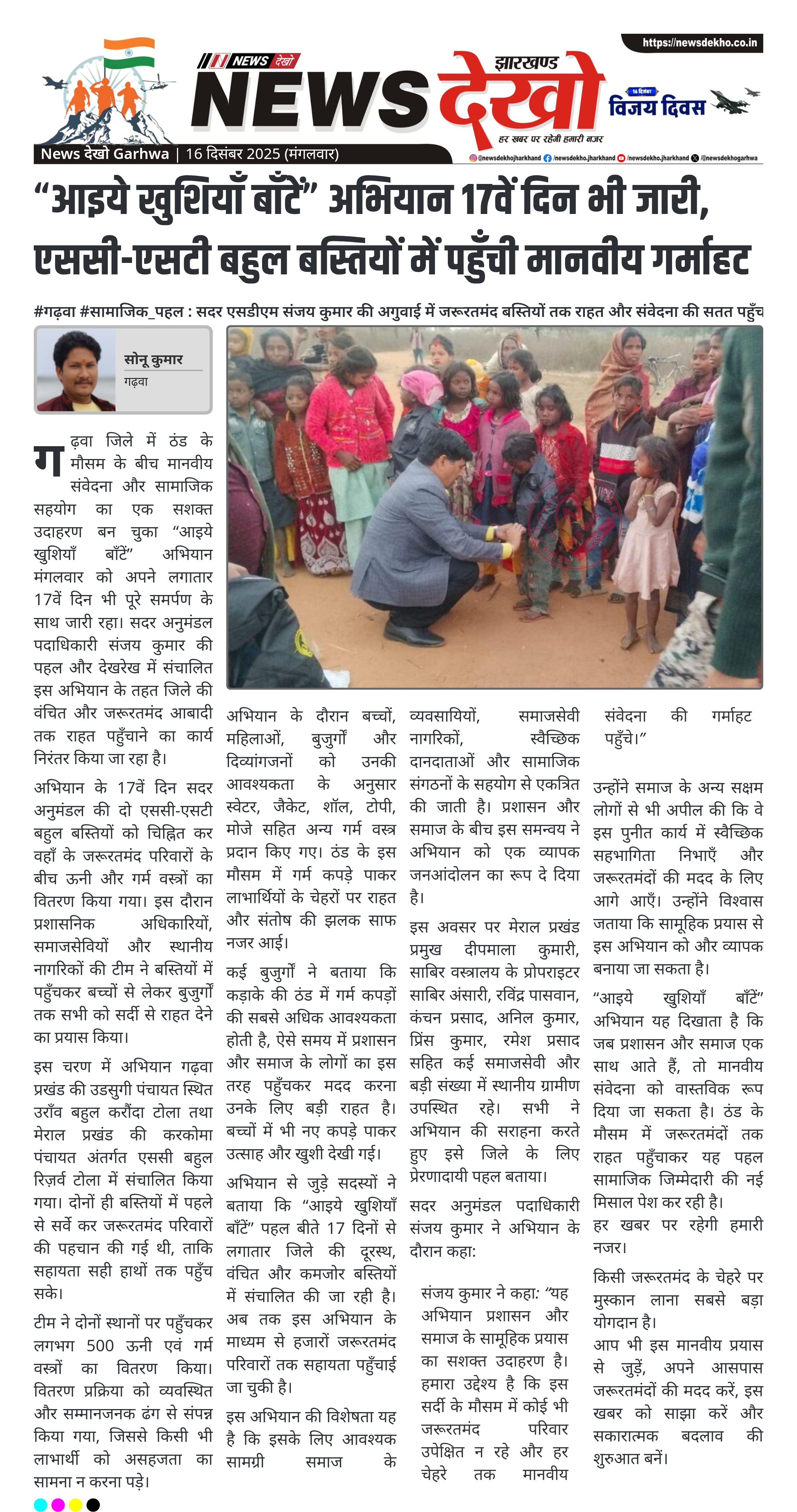 #गढ़वा #सामाजिक_पहल : सदर एसडीएम संजय कुमार की अगुवाई में जरूरतमंद बस्तियों तक राहत और संवेदना की सतत पहुँच “आइये खुशियाँ बाँटें” अभियान लगातार 17वें दिन भी सक्रिय। उडसुगी पंचायत के करौंदा टोला और करकोमा पंचायत के रिज़र्व टोला में राहत वितरण। एससी-एसटी बहुल बस्तियों में लगभग 500 ऊनी एवं गर्म वस्त्र वितरित। बच्चों, महिलाओं, बुजुर्गों व दिव्यांगजनों को स्वेटर, जैकेट, शॉल, टोपी, मोजे प्रदान। अभियान में प्रशासन, समाजसेवी, व्यवसायी व स्थानीय ग्रामीणों की सक्रिय सहभागिता। गढ़वा जिले में ठंड…