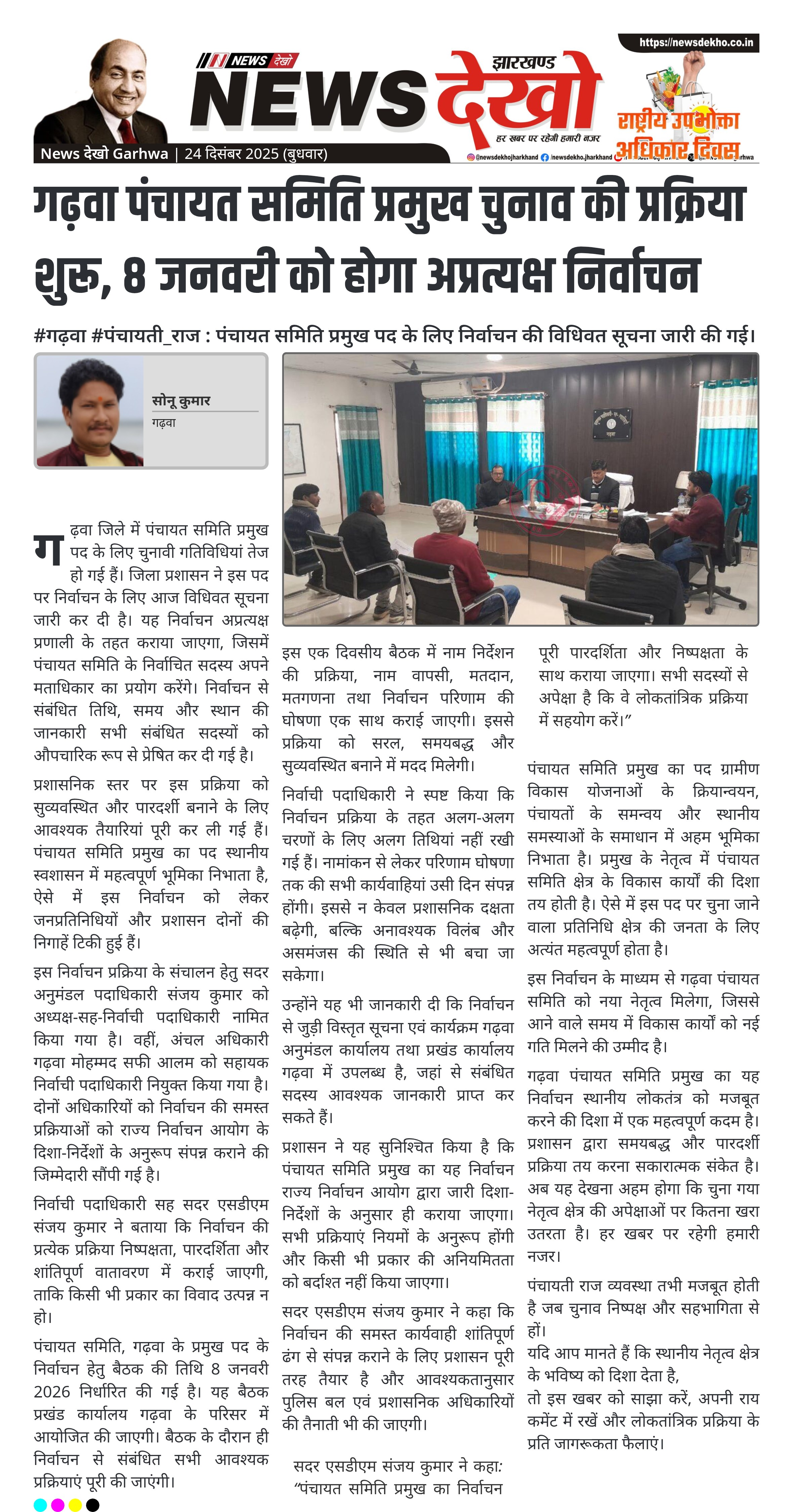 #गढ़वा #पंचायती_राज : पंचायत समिति प्रमुख पद के लिए निर्वाचन की विधिवत सूचना जारी की गई। गढ़वा पंचायत समिति प्रमुख पद के लिए निर्वाचन की अधिसूचना जारी। 8 जनवरी 2026 को प्रखंड कार्यालय गढ़वा में होगी निर्वाचन बैठक। सदर एसडीएम संजय कुमार बने अध्यक्ष-सह-निर्वाची पदाधिकारी। सीओ मोहम्मद सफी आलम को सहायक निर्वाची पदाधिकारी नियुक्त। नामांकन से लेकर मतदान और परिणाम घोषणा एक ही दिन होगी। गढ़वा जिले में पंचायत समिति प्रमुख पद के लिए चुनावी गतिविधियां तेज हो गई हैं।…