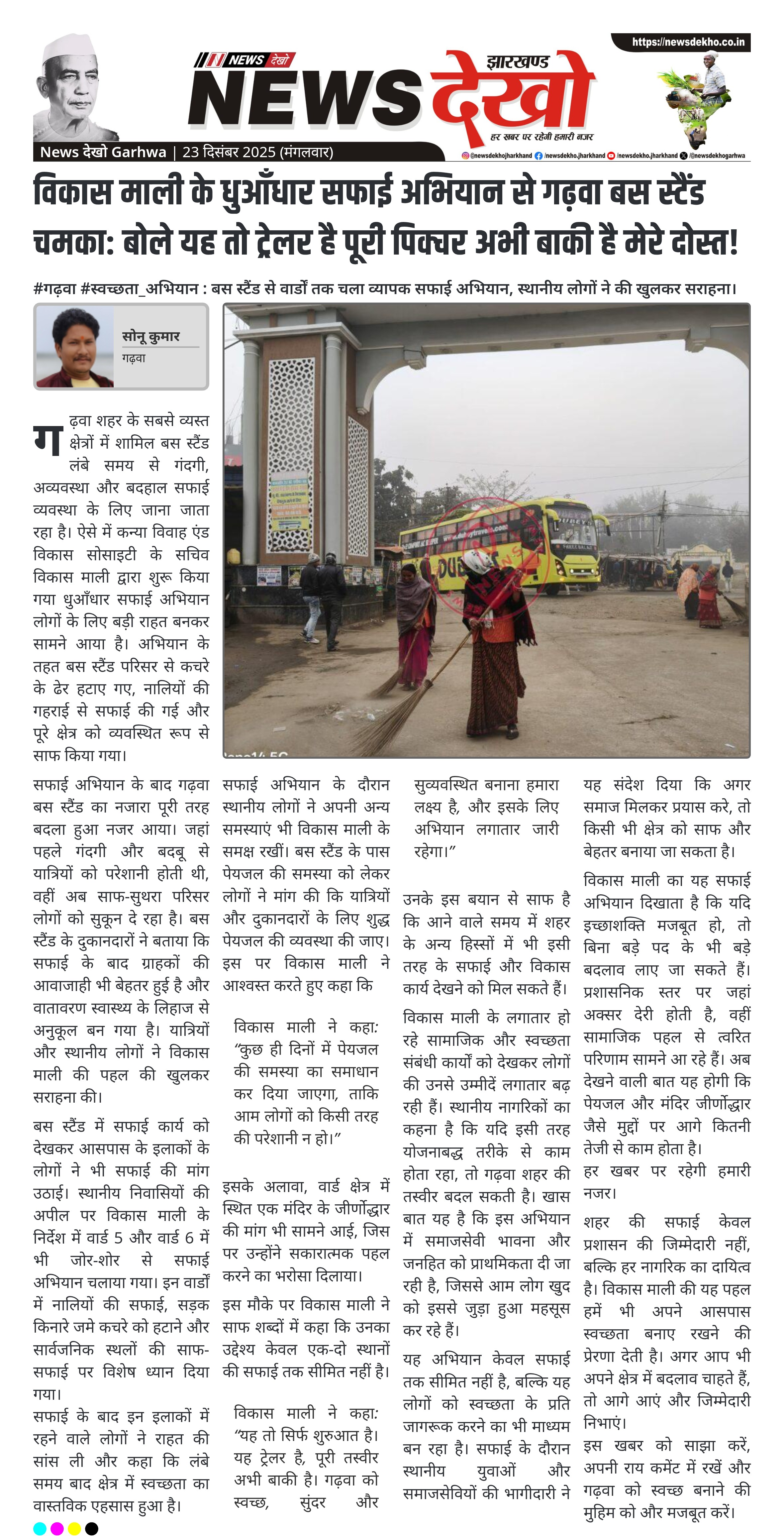 #गढ़वा #स्वच्छता_अभियान : बस स्टैंड से वार्डों तक चला व्यापक सफाई अभियान, स्थानीय लोगों ने की खुलकर सराहना। गढ़वा बस स्टैंड में व्यापक सफाई अभियान, वर्षों पुरानी गंदगी हटाई गई। कन्या विवाह एंड विकास सोसाइटी के सचिव विकास माली ने की अगुवाई। वार्ड 5 और वार्ड 6 में भी स्थानीय मांग पर चला सफाई अभियान। नालियों की सफाई, कचरा हटाने और साज-सफाई से बदला इलाकों का माहौल। पेयजल और मंदिर जीर्णोद्धार की मांगों पर जल्द समाधान का आश्वासन। गढ़वा शहर…