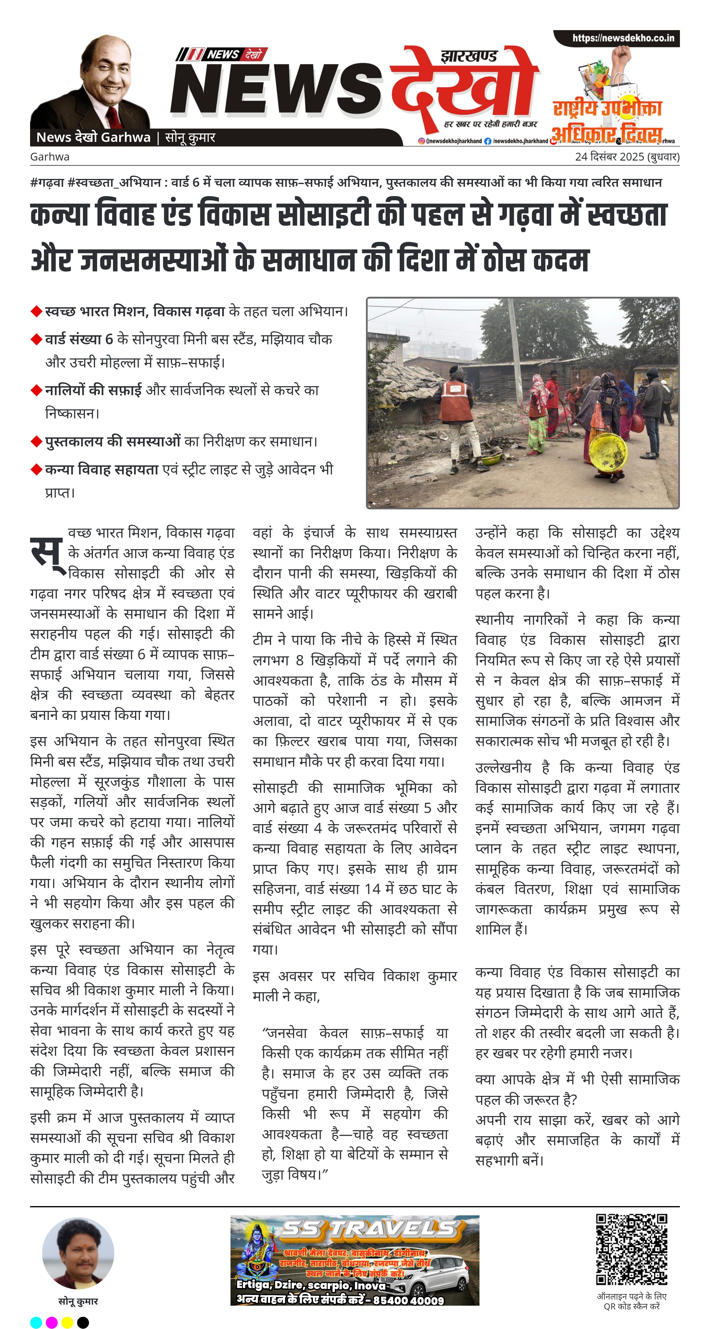 कन्या विवाह एंड विकास सोसाइटी की पहल से गढ़वा में स्वच्छता और जनसमस्याओं के समाधान की दिशा में ठोस कदम