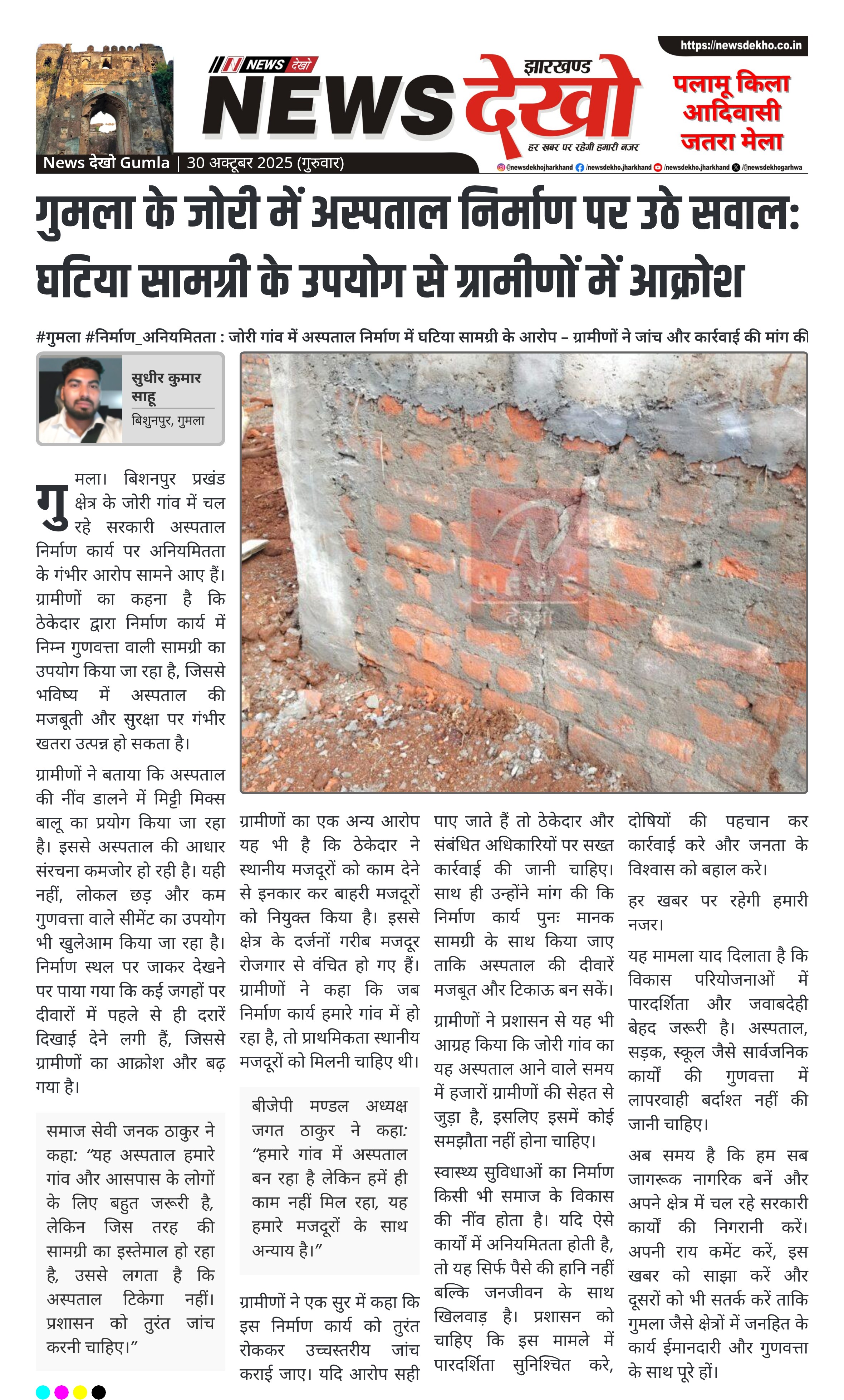 #गुमला #निर्माण_अनियमितता : जोरी गांव में अस्पताल निर्माण में घटिया सामग्री के आरोप – ग्रामीणों ने जांच और कार्रवाई की मांग की गुमला जिला के बिशनपुर प्रखंड के जोरी गांव में हो रहे अस्पताल निर्माण कार्य पर ग्रामीणों ने गंभीर आरोप लगाए। ग्रामीणों का कहना है कि मिट्टी मिक्स बालू, घटिया सीमेंट और लोकल छड़ का उपयोग किया जा रहा है। निर्माणाधीन दीवारों में दरारें आने से अस्पताल की मजबूती पर सवाल खड़े हो गए हैं। ग्रामीणों ने निर्माण कार्य…