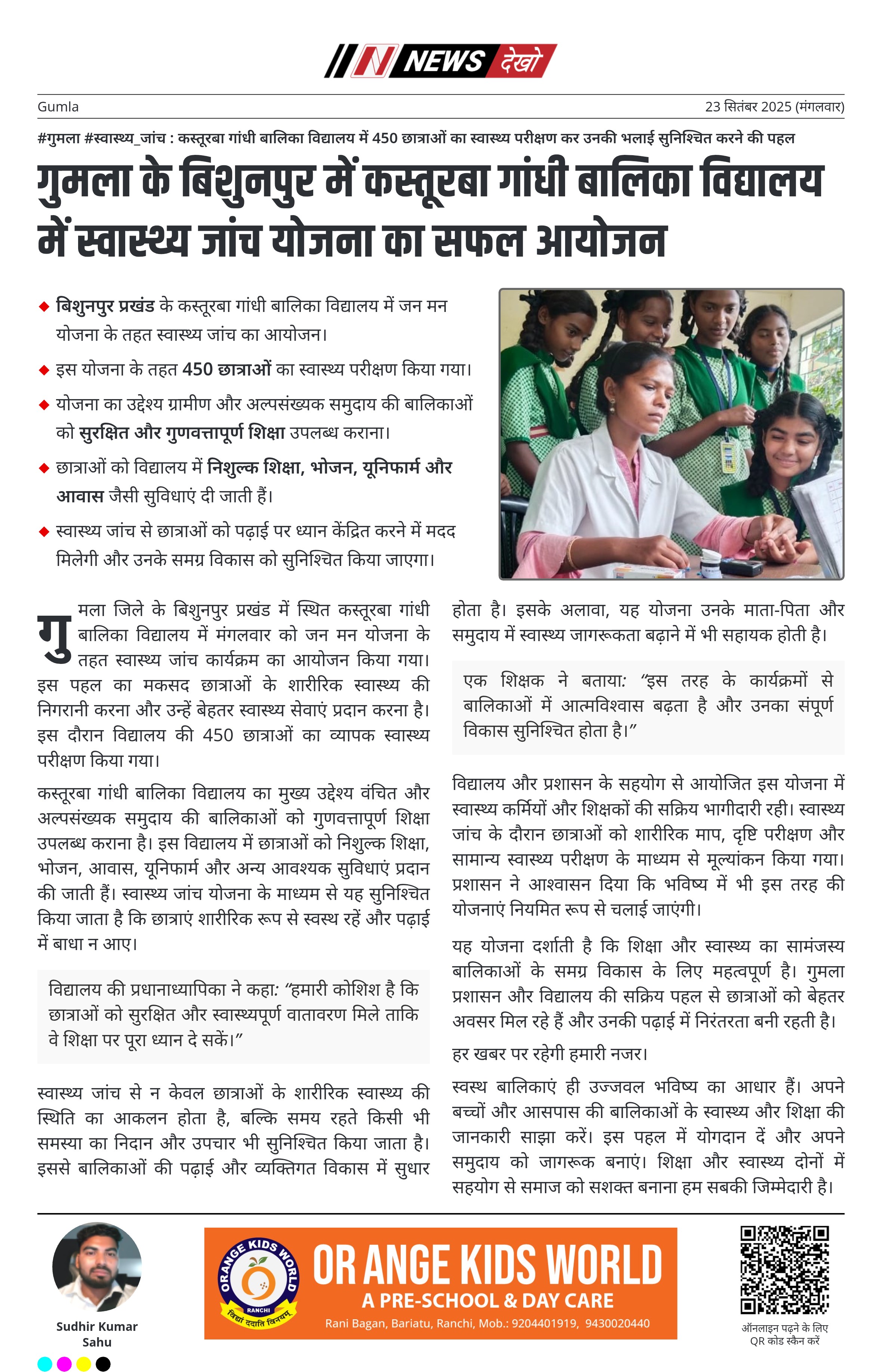 गुमला के बिशुनपुर में कस्तूरबा गांधी बालिका विद्यालय में स्वास्थ्य जांच योजना का सफल आयोजन