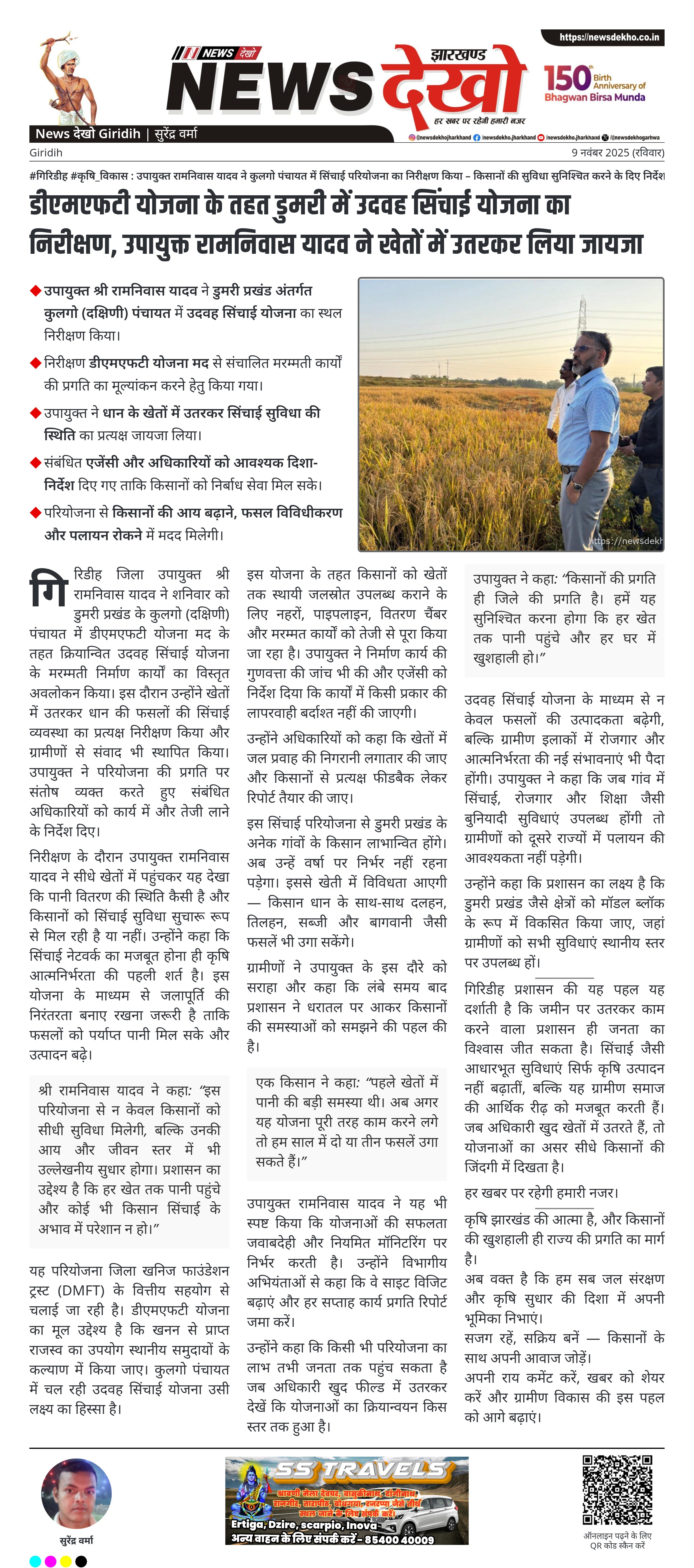 #गिरिडीह #कृषि_विकास : उपायुक्त रामनिवास यादव ने कुलगो पंचायत में सिंचाई परियोजना का निरीक्षण किया – किसानों की सुविधा सुनिश्चित करने के दिए निर्देश उपायुक्त श्री रामनिवास यादव ने डुमरी प्रखंड अंतर्गत कुलगो (दक्षिणी) पंचायत में उदवह सिंचाई योजना का स्थल निरीक्षण किया। निरीक्षण डीएमएफटी योजना मद से संचालित मरम्मती कार्यों की प्रगति का मूल्यांकन करने हेतु किया गया। उपायुक्त ने धान के खेतों में उतरकर सिंचाई सुविधा की स्थिति का प्रत्यक्ष जायजा लिया। संबंधित एजेंसी और अधिकारियों को आवश्यक…