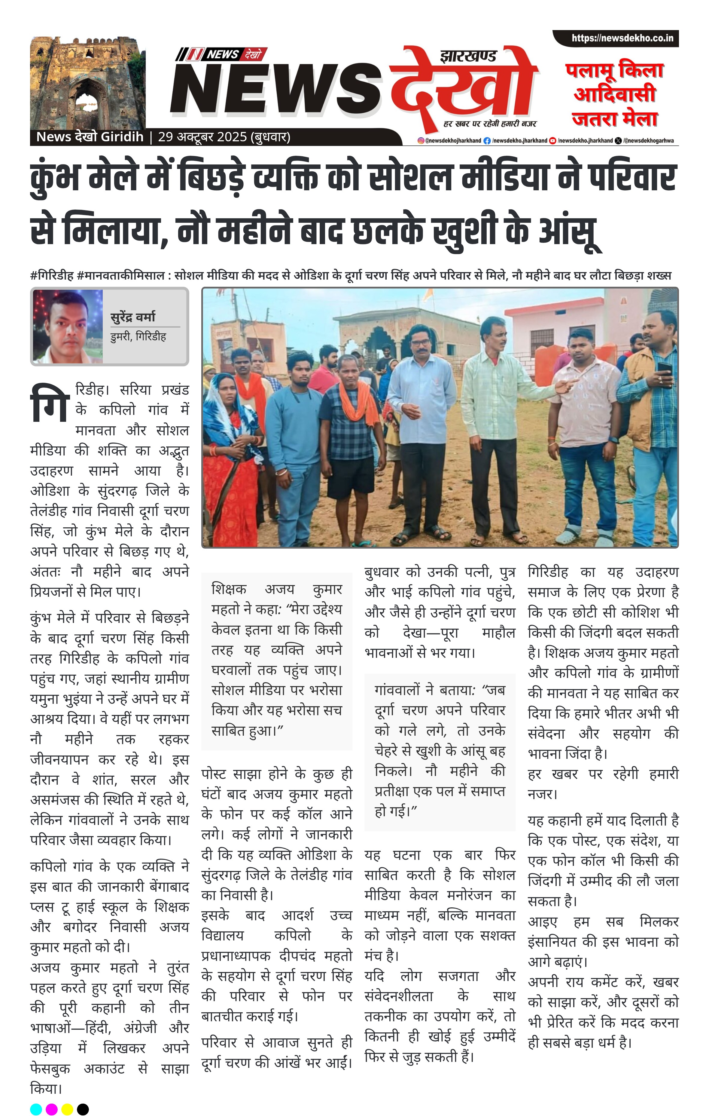 #गिरिडीह #मानवताकीमिसाल : सोशल मीडिया की मदद से ओडिशा के दूर्गा चरण सिंह अपने परिवार से मिले, नौ महीने बाद घर लौटा बिछड़ा शख्स कुंभ मेले में बिछड़े ओडिशा के दूर्गा चरण सिंह को सोशल मीडिया के जरिए परिवार से मिलाया गया। व्यक्ति गिरिडीह जिले के सरिया प्रखंड के कपिलो गांव में नौ महीने से रह रहा था। अजय कुमार महतो, शिक्षक, ने पोस्ट को हिंदी, अंग्रेजी और उड़िया भाषा में शेयर किया। पोस्ट वायरल होने के बाद परिवार से…