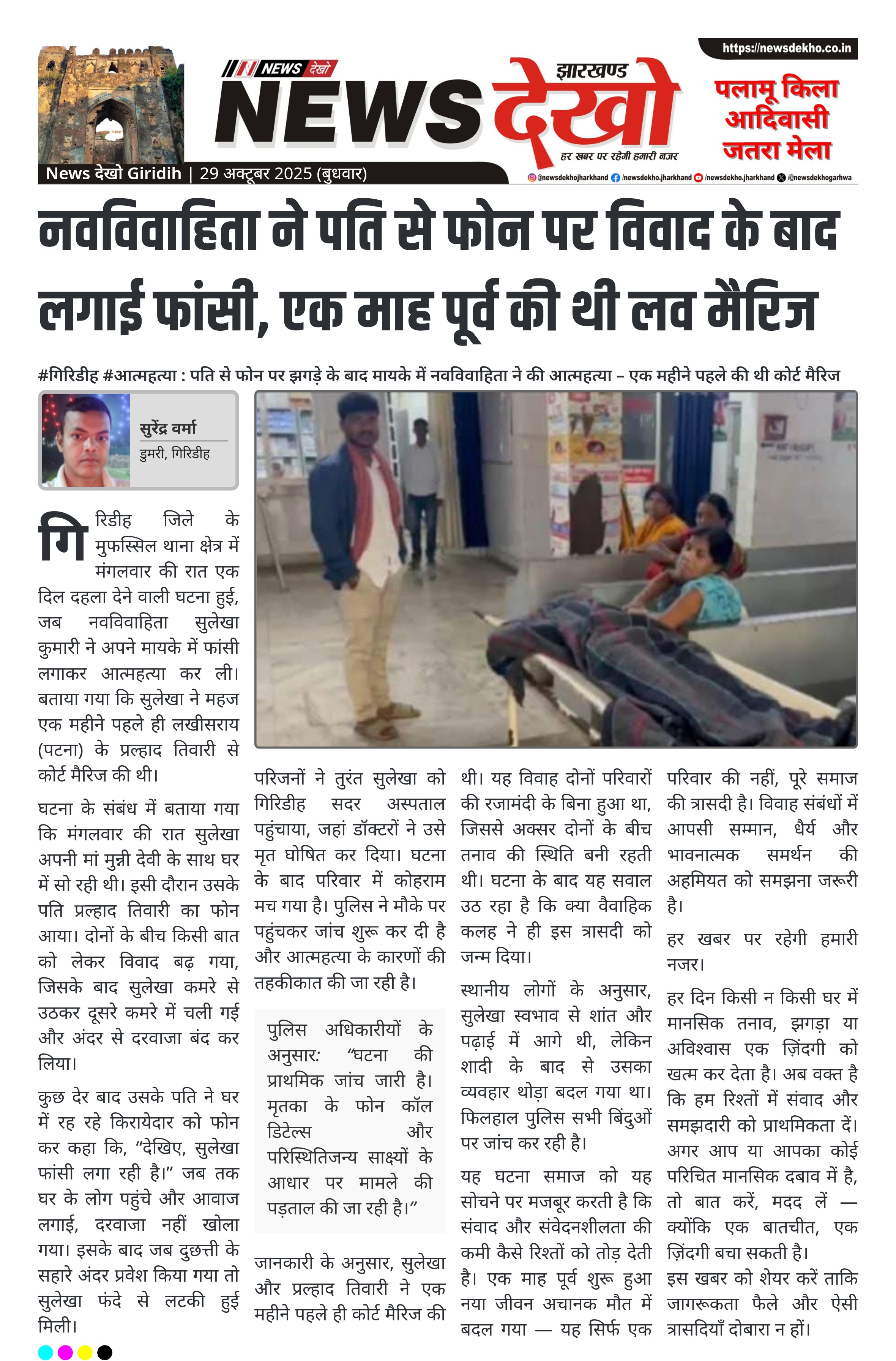 #गिरिडीह #आत्महत्या : पति से फोन पर झगड़े के बाद मायके में नवविवाहिता ने की आत्महत्या – एक महीने पहले की थी कोर्ट मैरिज गिरिडीह जिले के मुफस्सिल थाना क्षेत्र में नवविवाहिता सुलेखा कुमारी ने फांसी लगाकर जीवन समाप्त कर लिया। पति प्रल्हाद तिवारी से फोन पर विवाद के बाद हुई यह दुखद घटना। सुलेखा ने एक माह पूर्व पटना के लखीसराय निवासी युवक से लव मैरिज की थी। घटना के वक्त मां मुन्नी देवी के साथ सो रही थी,…
