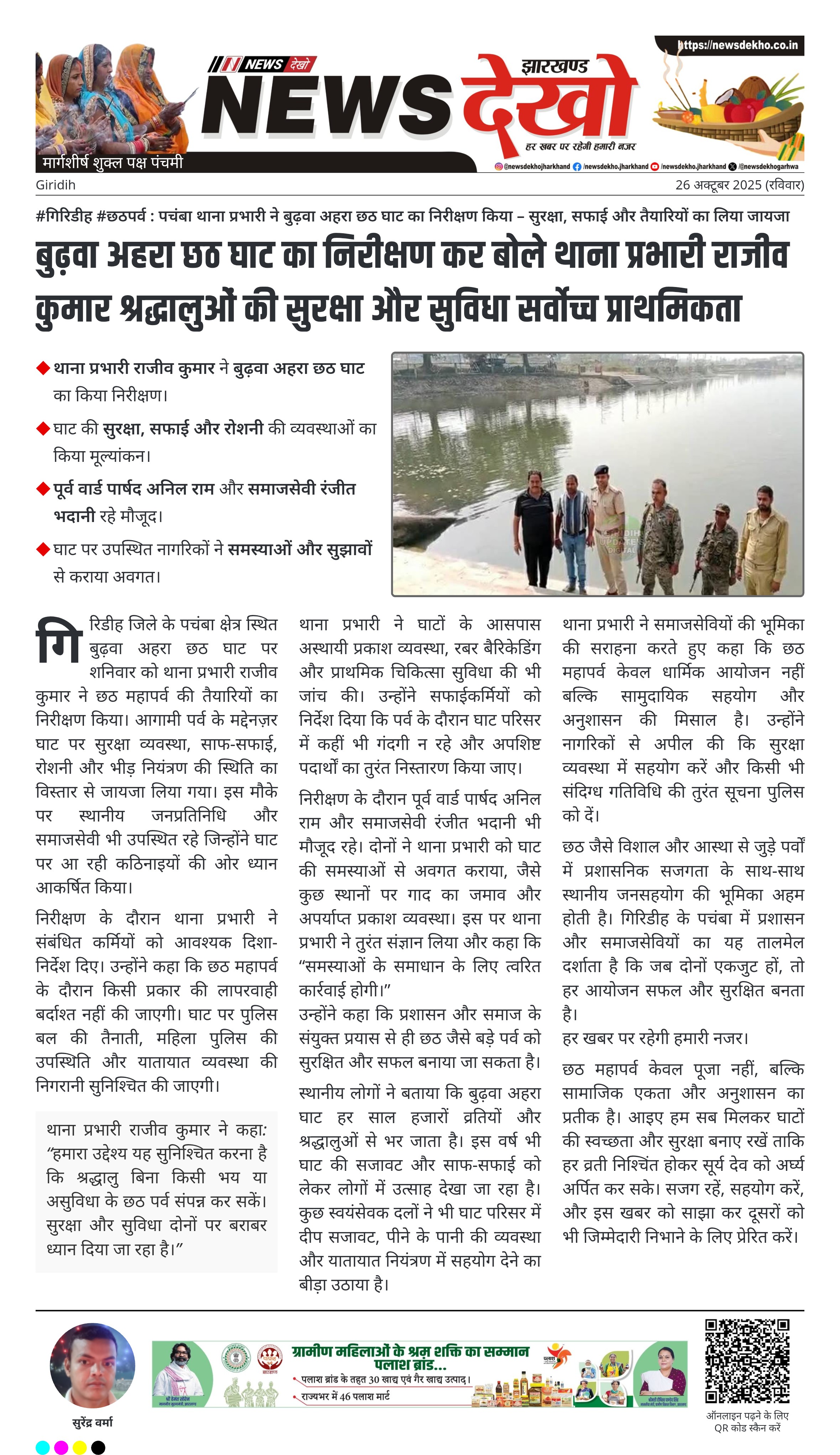 #गिरिडीह #छठपर्व : पचंबा थाना प्रभारी ने बुढ़वा अहरा छठ घाट का निरीक्षण किया – सुरक्षा, सफाई और तैयारियों का लिया जायजा थाना प्रभारी राजीव कुमार ने बुढ़वा अहरा छठ घाट का किया निरीक्षण। घाट की सुरक्षा, सफाई और रोशनी की व्यवस्थाओं का किया मूल्यांकन। पूर्व वार्ड पार्षद अनिल राम और समाजसेवी रंजीत भदानी रहे मौजूद। घाट पर उपस्थित नागरिकों ने समस्याओं और सुझावों से कराया अवगत। थाना प्रभारी ने कहा — श्रद्धालुओं की सुरक्षा प्रशासन की सर्वोच्च प्राथमिकता। गिरिडीह…