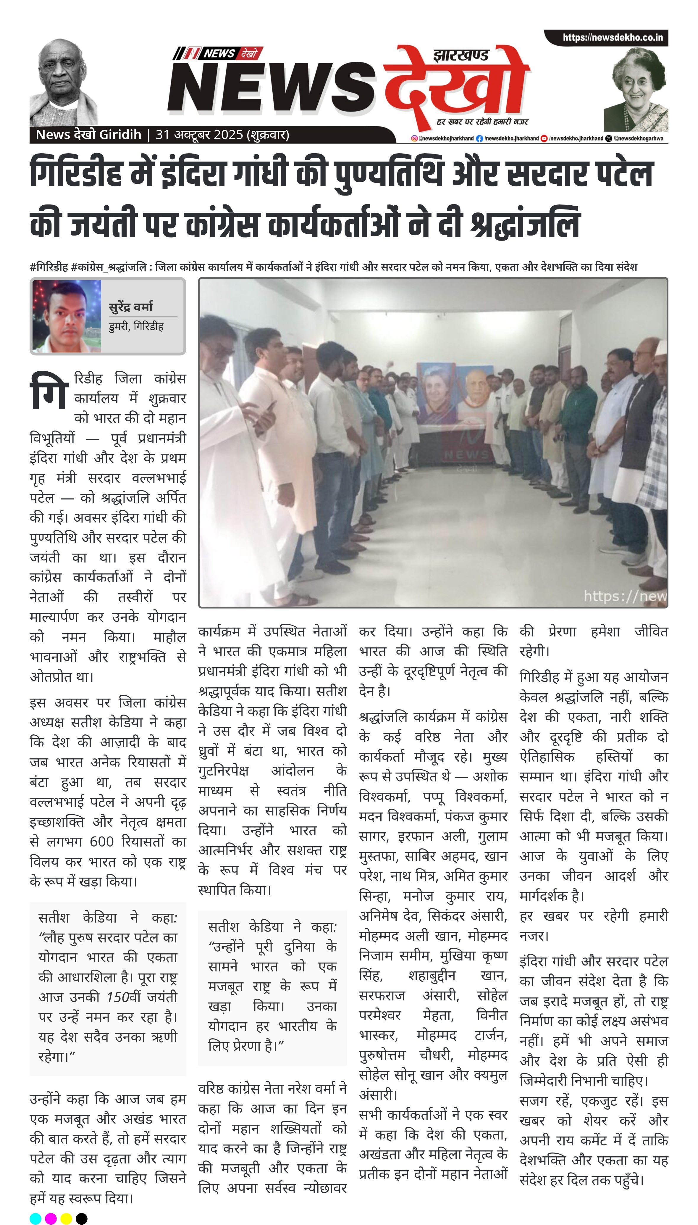 #गिरिडीह #कांग्रेस_श्रद्धांजलि : जिला कांग्रेस कार्यालय में कार्यकर्ताओं ने इंदिरा गांधी और सरदार पटेल को नमन किया, एकता और देशभक्ति का दिया संदेश गिरिडीह जिला कांग्रेस कार्यालय में शुक्रवार को इंदिरा गांधी की पुण्यतिथि और सरदार वल्लभभाई पटेल की जयंती मनाई गई। पार्टी नेताओं और कार्यकर्ताओं ने दोनों महान नेताओं के तस्वीर पर माल्यार्पण कर श्रद्धांजलि अर्पित की। जिला अध्यक्ष सतीश केडिया ने कहा कि पटेल जी ने 600 रियासतों को भारत में मिलाकर देश को एकता के सूत्र में…