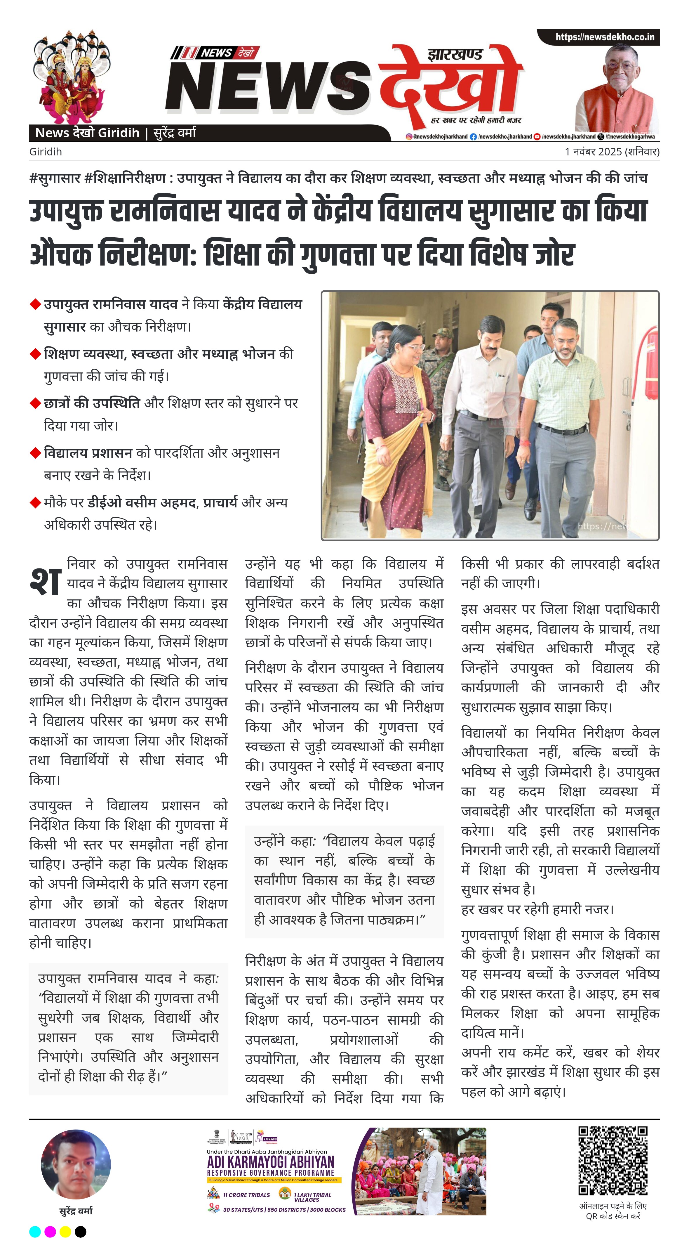 #सुगासार #शिक्षानिरीक्षण : उपायुक्त ने विद्यालय का दौरा कर शिक्षण व्यवस्था, स्वच्छता और मध्याह्न भोजन की की जांच उपायुक्त रामनिवास यादव ने किया केंद्रीय विद्यालय सुगासार का औचक निरीक्षण। शिक्षण व्यवस्था, स्वच्छता और मध्याह्न भोजन की गुणवत्ता की जांच की गई। छात्रों की उपस्थिति और शिक्षण स्तर को सुधारने पर दिया गया जोर। विद्यालय प्रशासन को पारदर्शिता और अनुशासन बनाए रखने के निर्देश। मौके पर डीईओ वसीम अहमद, प्राचार्य और अन्य अधिकारी उपस्थित रहे। शनिवार को उपायुक्त रामनिवास यादव ने…