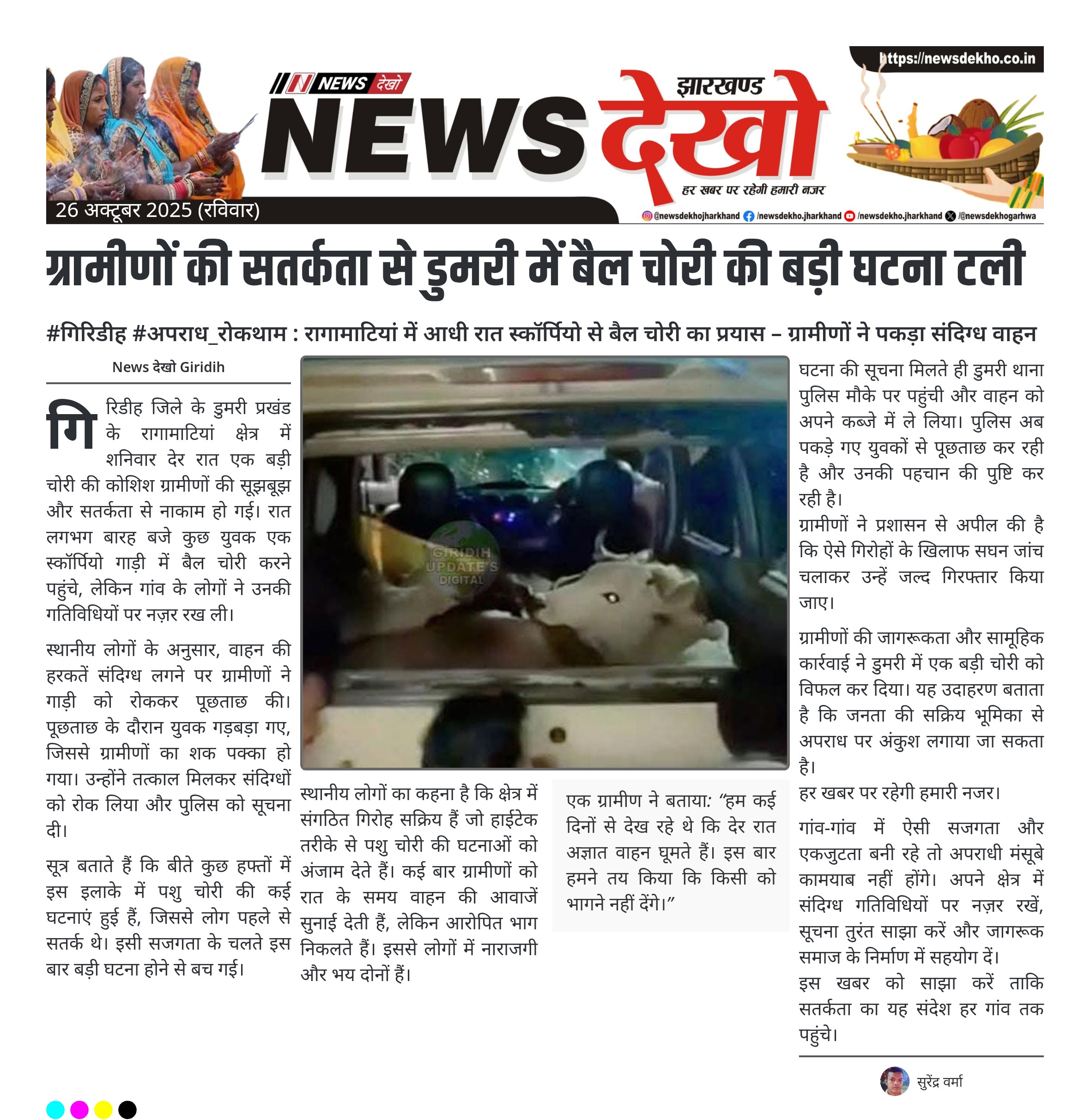 ग्रामीणों की सतर्कता से डुमरी में बैल चोरी की बड़ी घटना टली