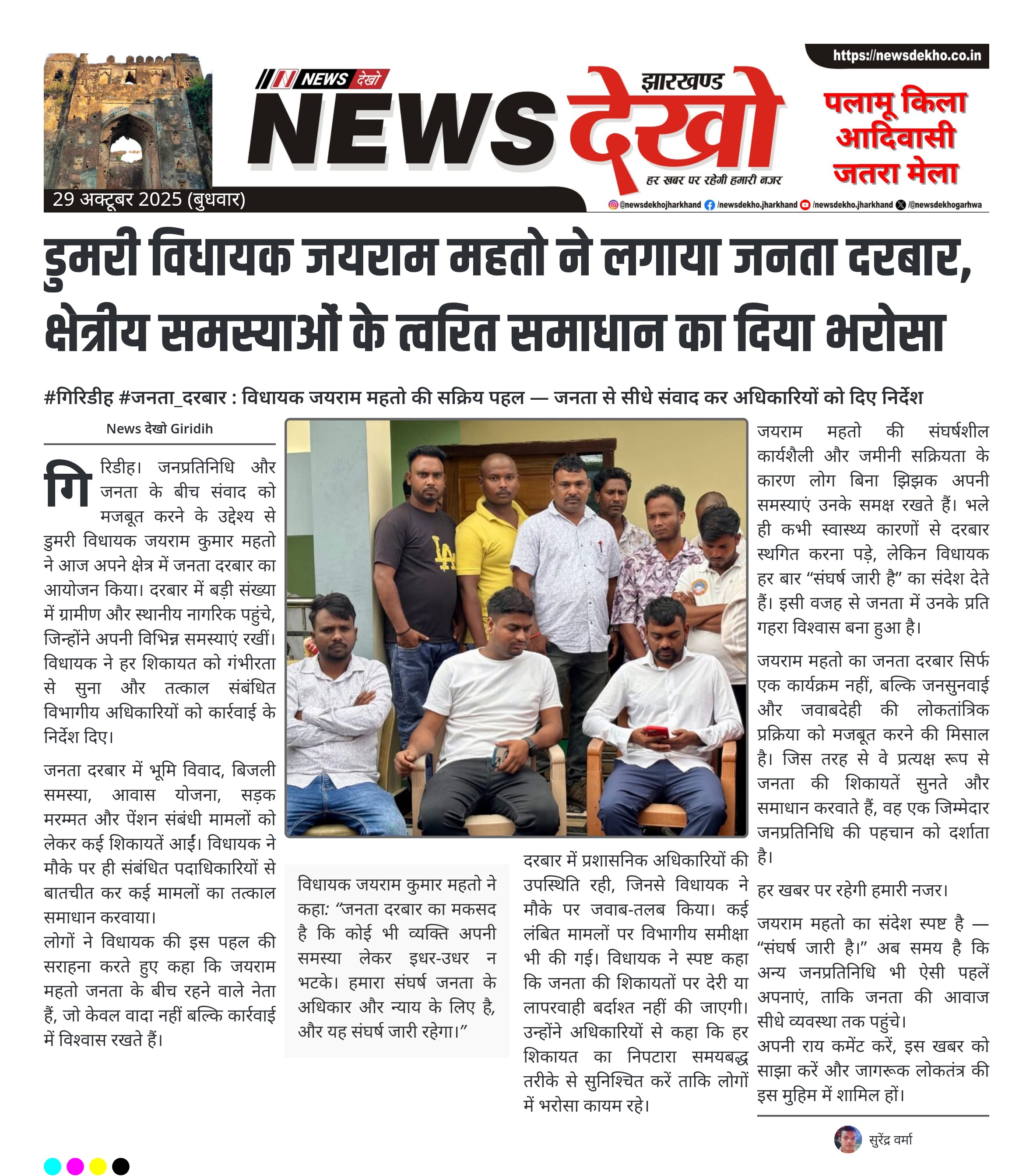 #गिरिडीह #जनता_दरबार : विधायक जयराम महतो की सक्रिय पहल — जनता से सीधे संवाद कर अधिकारियों को दिए निर्देश डुमरी विधायक जयराम कुमार महतो ने आज सुबह जनता दरबार का आयोजन किया। क्षेत्रवासियों की शिकायतें सुनकर तत्काल समाधान के निर्देश दिए। संबंधित अधिकारियों से मौके पर जवाब-तलब कर कार्रवाई सुनिश्चित की गई। डुमरी, नवाडीह और चंद्रपुरा क्षेत्रों में नियत दिन पर जनता दरबार आयोजित होता है। विधायक ने कहा — “संघर्ष जारी है, जनता के हित में हर कदम पर…