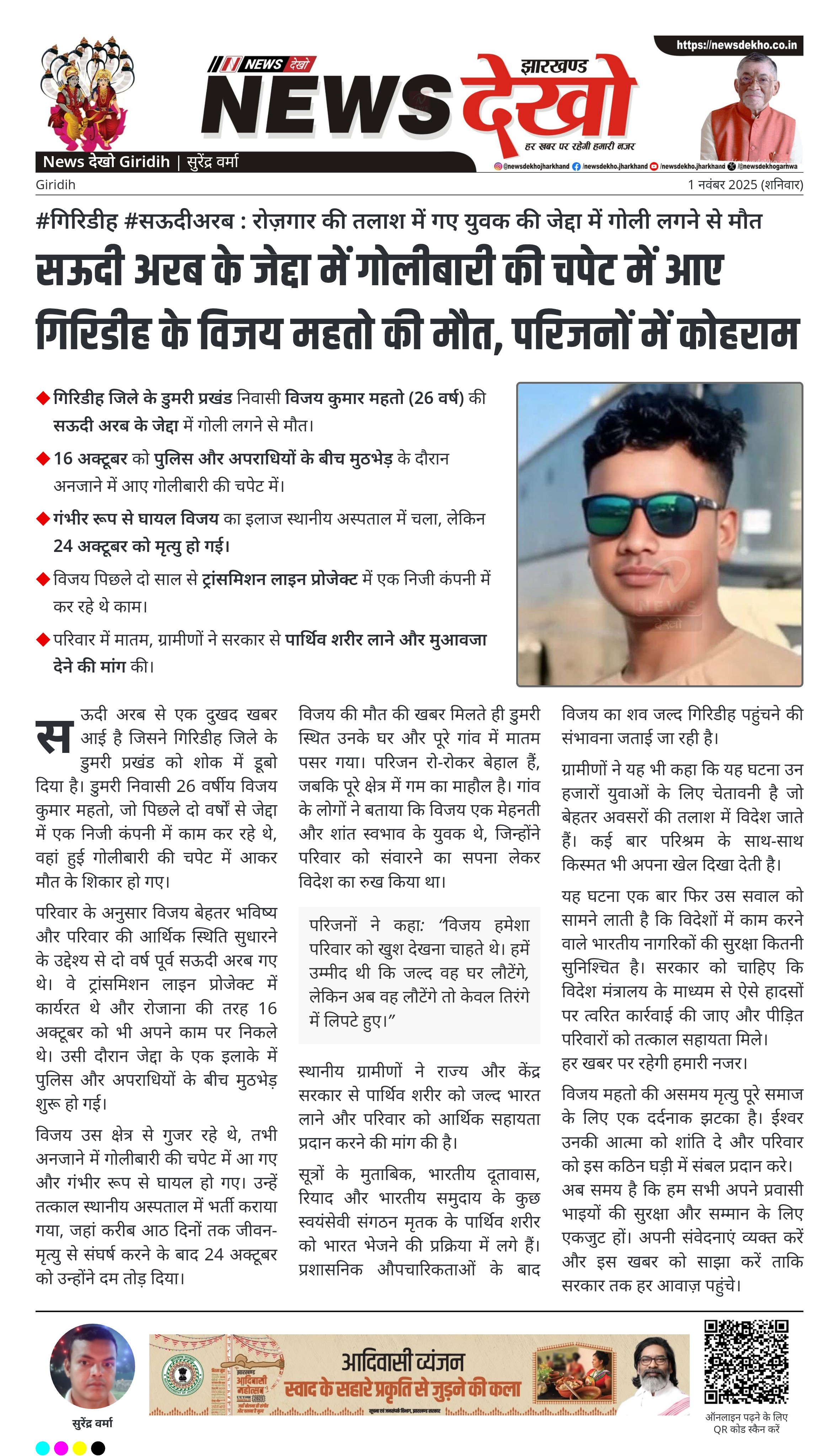 #गिरिडीह #सऊदीअरब : रोज़गार की तलाश में गए युवक की जेद्दा में गोली लगने से मौत गिरिडीह जिले के डुमरी प्रखंड निवासी विजय कुमार महतो (26 वर्ष) की सऊदी अरब के जेद्दा में गोली लगने से मौत। 16 अक्टूबर को पुलिस और अपराधियों के बीच मुठभेड़ के दौरान अनजाने में आए गोलीबारी की चपेट में। गंभीर रूप से घायल विजय का इलाज स्थानीय अस्पताल में चला, लेकिन 24 अक्टूबर को मृत्यु हो गई। विजय पिछले दो साल से ट्रांसमिशन लाइन…
