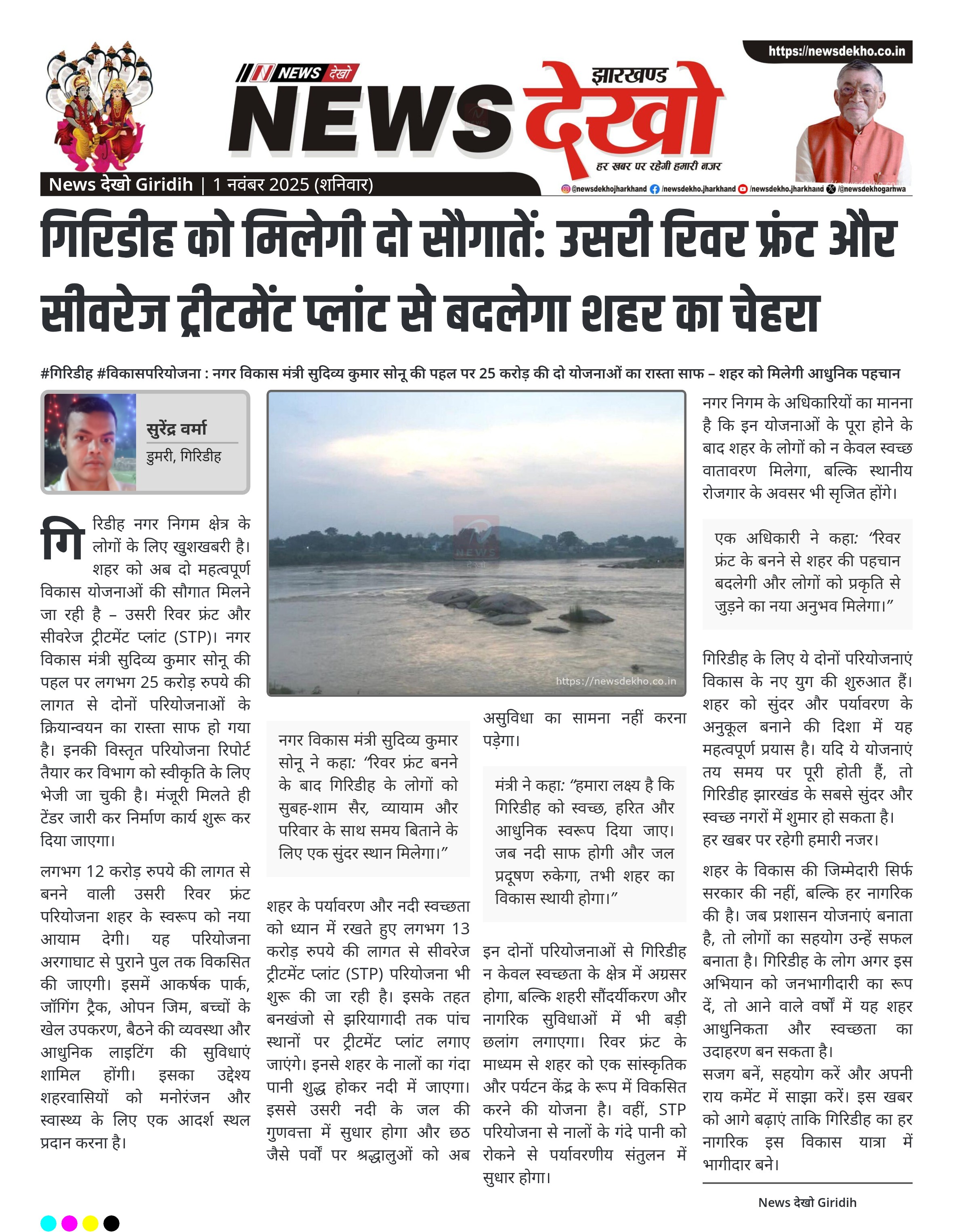 #गिरिडीह #विकासपरियोजना : नगर विकास मंत्री सुदिव्य कुमार सोनू की पहल पर 25 करोड़ की दो योजनाओं का रास्ता साफ – शहर को मिलेगी आधुनिक पहचान उसरी रिवर फ्रंट परियोजना पर खर्च होंगे लगभग 12 करोड़ रुपये। सीवरेज ट्रीटमेंट प्लांट (STP) के लिए निर्धारित किए गए 13 करोड़ रुपये। डीपीआर तैयार, अब नगर विकास एवं आवास विभाग से मंजूरी की प्रतीक्षा। अरगाघाट से पुराने पुल तक विकसित होगा रिवर फ्रंट, बनेगा पार्क और जॉगिंग ट्रैक। पांच स्थानों पर लगाए जाएंगे…
