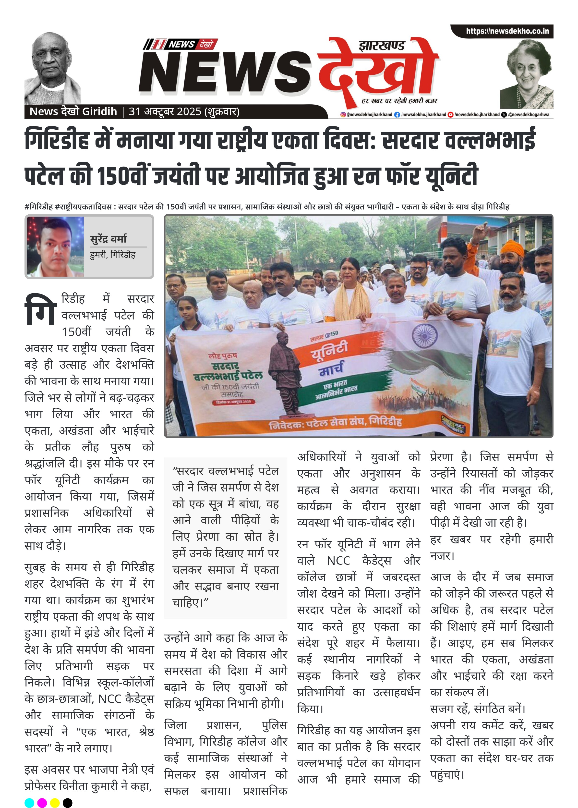 #गिरिडीह #राष्ट्रीयएकतादिवस : सरदार पटेल की 150वीं जयंती पर प्रशासन, सामाजिक संस्थाओं और छात्रों की संयुक्त भागीदारी – एकता के संदेश के साथ दौड़ा गिरिडीह गिरिडीह जिले में सरदार वल्लभभाई पटेल की 150वीं जयंती पर विशेष आयोजन। #RunForUnity कार्यक्रम में प्रशासन, सामाजिक संस्थाएं, छात्र-छात्राएं और NCC कैडेट्स ने लिया हिस्सा। कार्यक्रम में भाजपा नेत्री एवं प्रोफेसर विनीता कुमारी रहीं शामिल। राष्ट्रीय एकता दिवस के रूप में आयोजित यह कार्यक्रम एकता और अखंडता का प्रतीक बना। प्रतिभागियों ने भारत की विविधता…