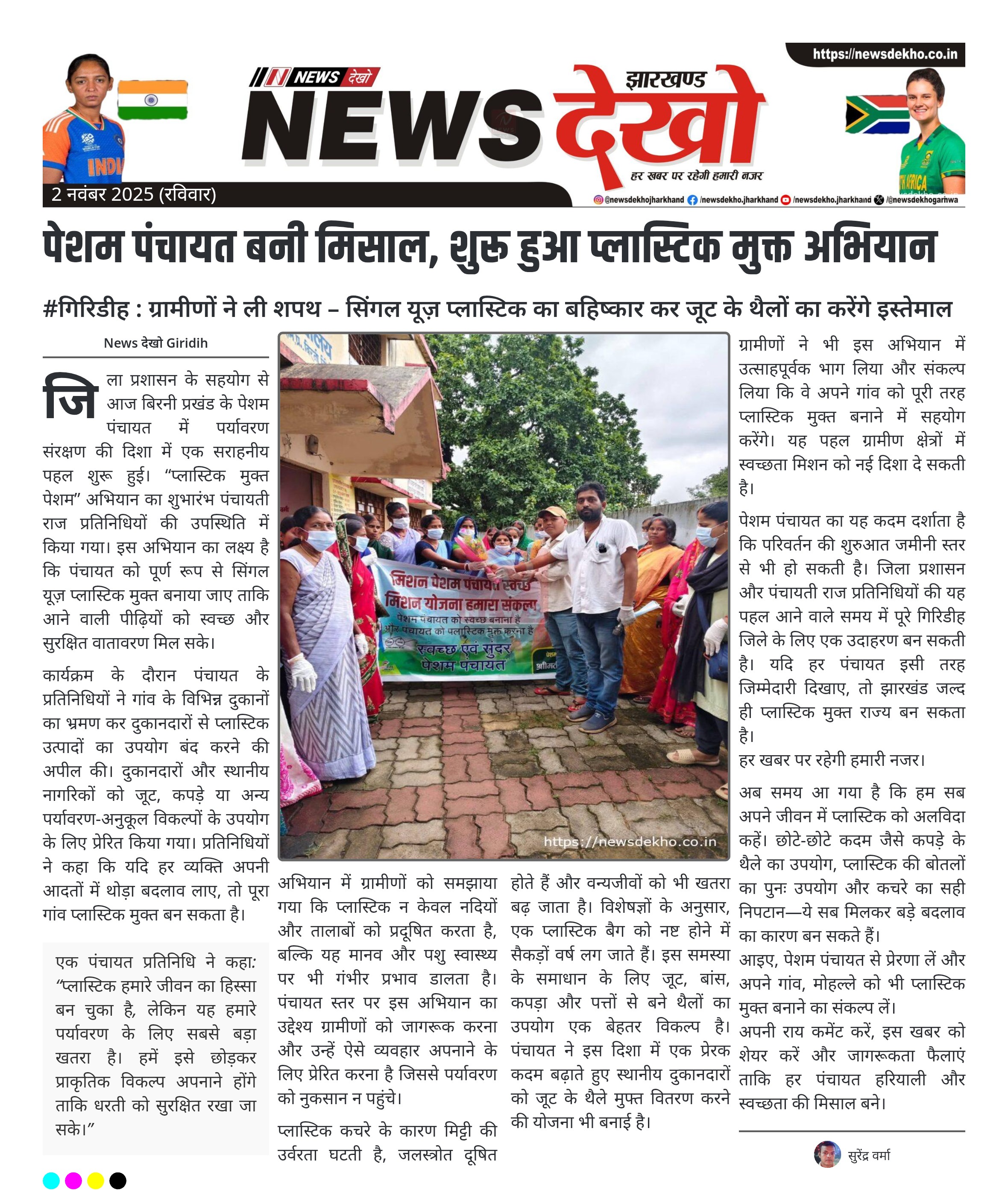 #गिरिडीह : ग्रामीणों ने ली शपथ – सिंगल यूज़ प्लास्टिक का बहिष्कार कर जूट के थैलों का करेंगे इस्तेमाल जिला उपायुक्त श्री रामनिवास यादव के मार्गदर्शन में बिरनी प्रखंड के पेशम पंचायत में प्लास्टिक मुक्त पेशम पहल की शुरुआत हुई। उप विकास आयुक्त के निर्देश पर पंचायती राज प्रतिनिधियों ने अभियान का नेतृत्व किया। प्रतिनिधियों ने दुकानदारों और आम नागरिकों से सिंगल यूज़ प्लास्टिक का प्रयोग बंद करने की अपील की। लोगों को जूट के थैलों का उपयोग बढ़ाने के…