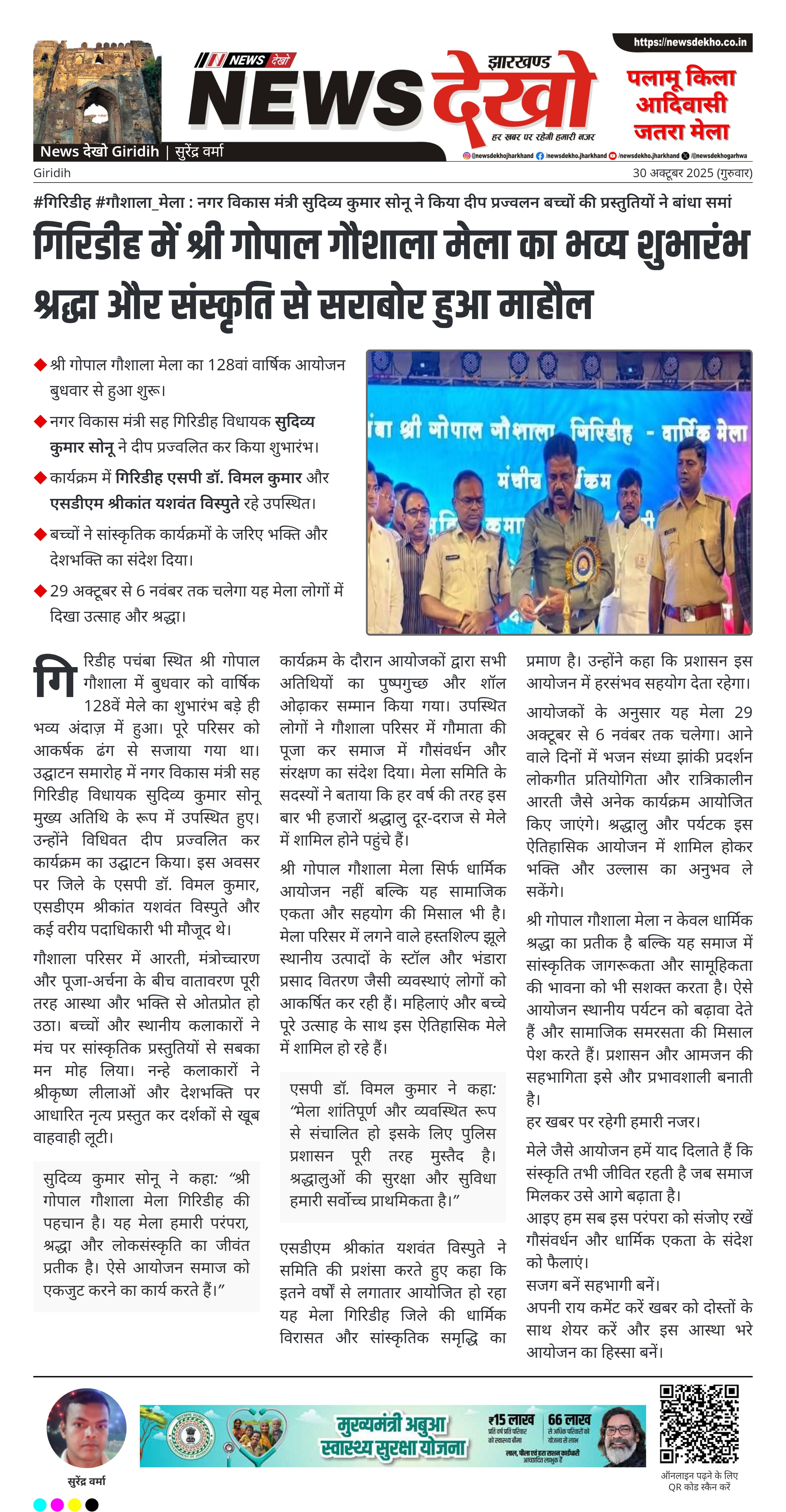 #गिरिडीह #गौशाला_मेला : नगर विकास मंत्री सुदिव्य कुमार सोनू ने किया दीप प्रज्वलन बच्चों की प्रस्तुतियों ने बांधा समां श्री गोपाल गौशाला मेला का 128वां वार्षिक आयोजन बुधवार से हुआ शुरू। नगर विकास मंत्री सह गिरिडीह विधायक सुदिव्य कुमार सोनू ने दीप प्रज्वलित कर किया शुभारंभ। कार्यक्रम में गिरिडीह एसपी डॉ. विमल कुमार और एसडीएम श्रीकांत यशवंत विस्पुते रहे उपस्थित। बच्चों ने सांस्कृतिक कार्यक्रमों के जरिए भक्ति और देशभक्ति का संदेश दिया। 29 अक्टूबर से 6 नवंबर तक चलेगा यह…