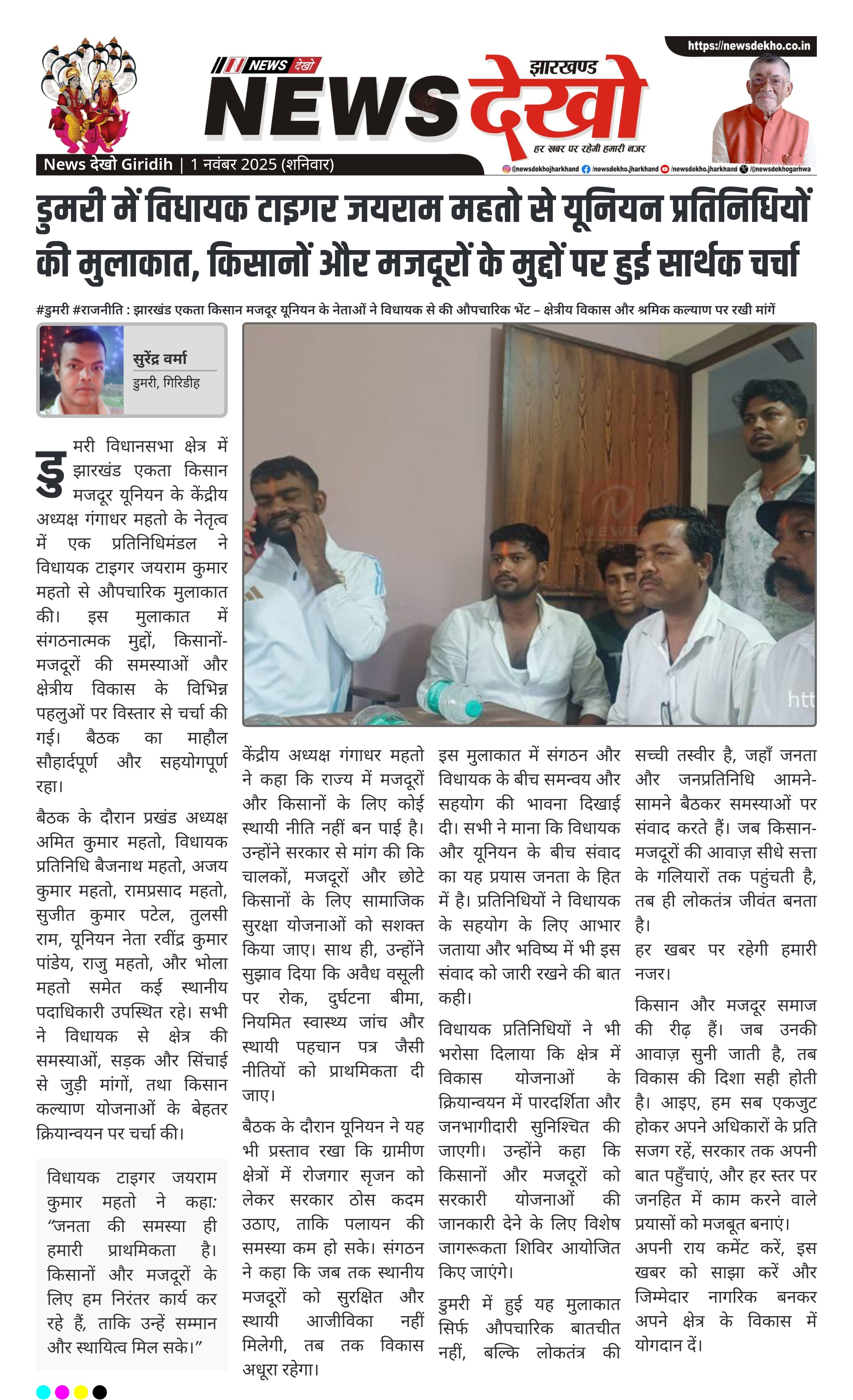 #डुमरी #राजनीति : झारखंड एकता किसान मजदूर यूनियन के नेताओं ने विधायक से की औपचारिक भेंट – क्षेत्रीय विकास और श्रमिक कल्याण पर रखी मांगें डुमरी विधायक टाइगर जयराम कुमार महतो से यूनियन पदाधिकारियों ने की औपचारिक मुलाकात। गंगाधर महतो, अमित कुमार महतो, और कई विधायक प्रतिनिधि रहे उपस्थित। किसान-मजदूर सुरक्षा, बीमा और पहचान पत्र पर हुई चर्चा। विकास योजनाओं में जनभागीदारी बढ़ाने पर जोर दिया गया। लोकतांत्रिक संवाद के इस प्रयास को क्षेत्र में सराहा गया। डुमरी विधानसभा क्षेत्र…