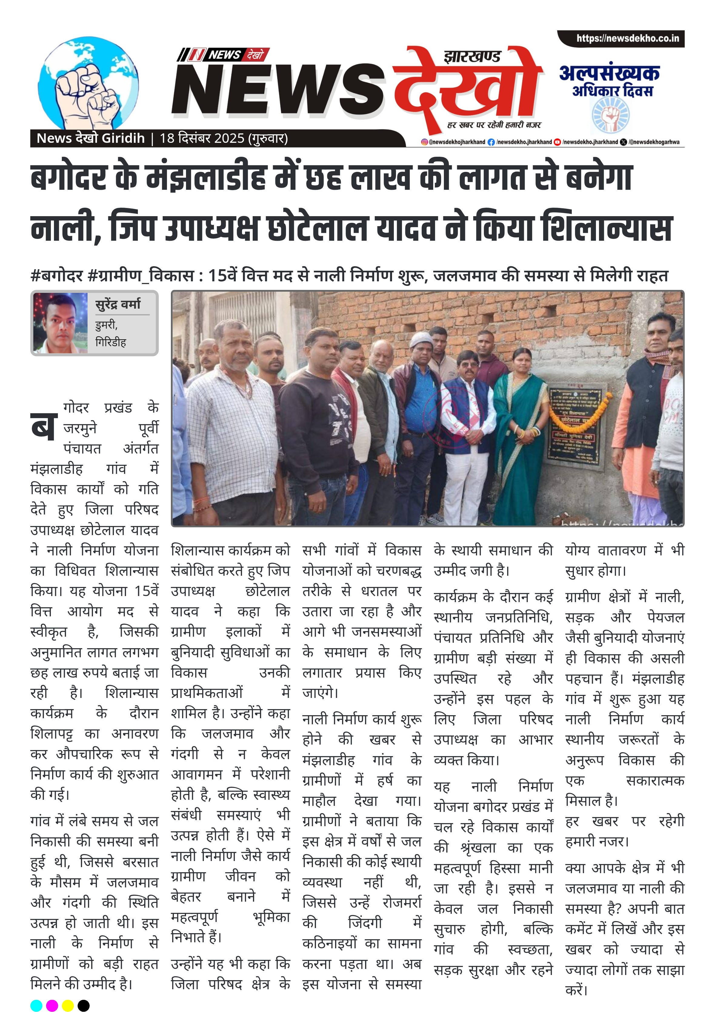 #बगोदर #ग्रामीण_विकास : 15वें वित्त मद से नाली निर्माण शुरू, जलजमाव की समस्या से मिलेगी राहत जरमुने पूर्वी पंचायत के मंझलाडीह गांव में नाली निर्माण कार्य का शुभारंभ। जिला परिषद उपाध्यक्ष छोटेलाल यादव ने विधिवत शिलान्यास किया। योजना 15वें वित्त आयोग मद से लगभग ₹6 लाख की लागत से स्वीकृत। लंबे समय से चली आ रही जल निकासी की समस्या होगी दूर। नाली निर्माण से स्वच्छता और ग्रामीण जीवन स्तर में होगा सुधार। बगोदर प्रखंड के जरमुने पूर्वी पंचायत अंतर्गत…