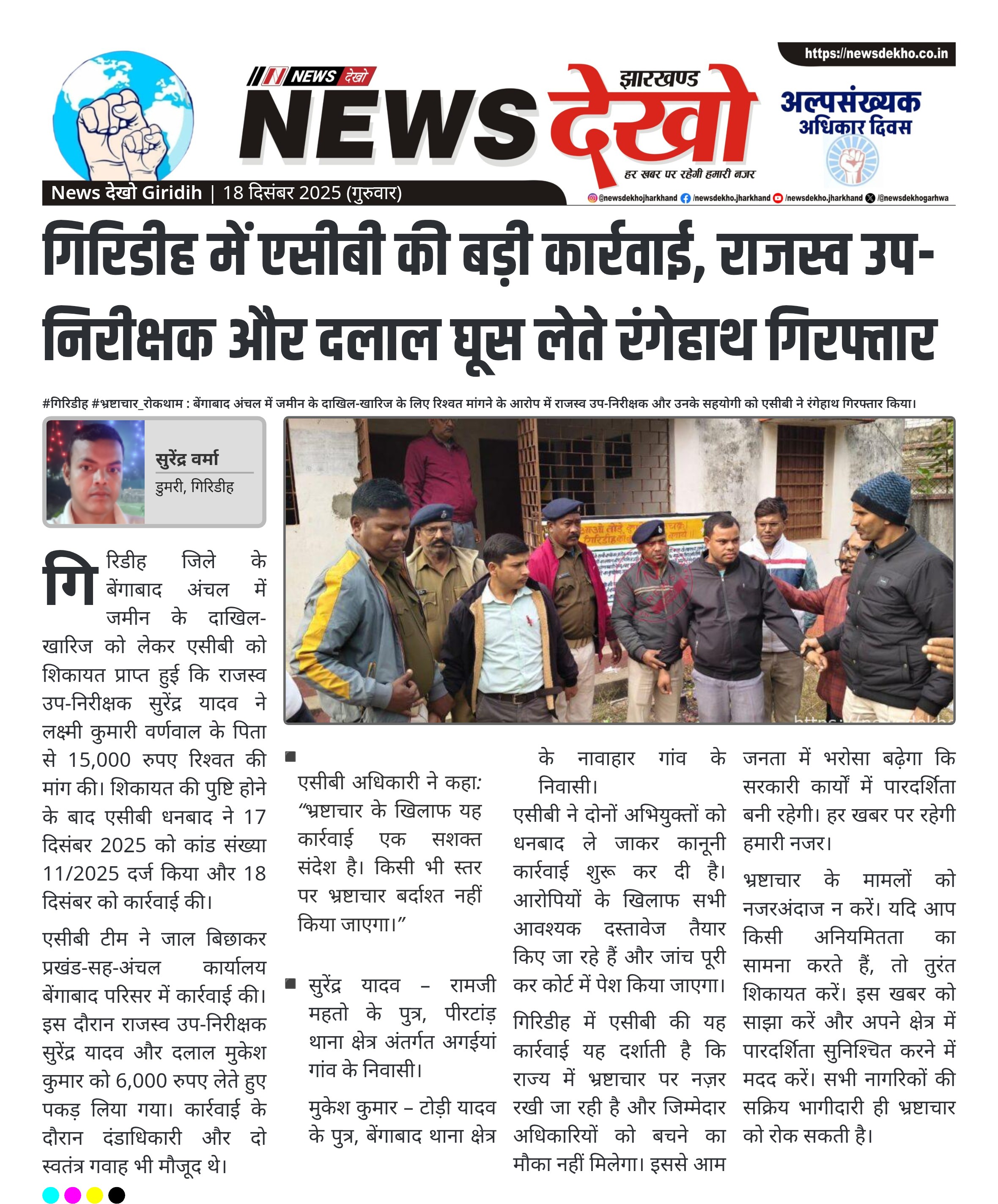 #गिरिडीह #भ्रष्टाचार_रोकथाम : बेंगाबाद अंचल में जमीन के दाखिल-खारिज के लिए रिश्वत मांगने के आरोप में राजस्व उप-निरीक्षक और उनके सहयोगी को एसीबी ने रंगेहाथ गिरफ्तार किया। राजस्व उप-निरीक्षक सुरेंद्र यादव और दलाल मुकेश कुमार गिरफ्तार। आरोप: जमीन के दाखिल-खारिज के लिए 15,000 रुपए रिश्वत की मांग। शिकायत मिलने के बाद एसीबी ने जाल बिछाकर कार्रवाई की। कार्रवाई में 6,000 रुपए लेते हुए दोनों रंगेहाथ पकड़े गए। दोनों को धनबाद ले जाया गया और कानूनी प्रक्रिया जारी। अभियुक्तों के साथ…