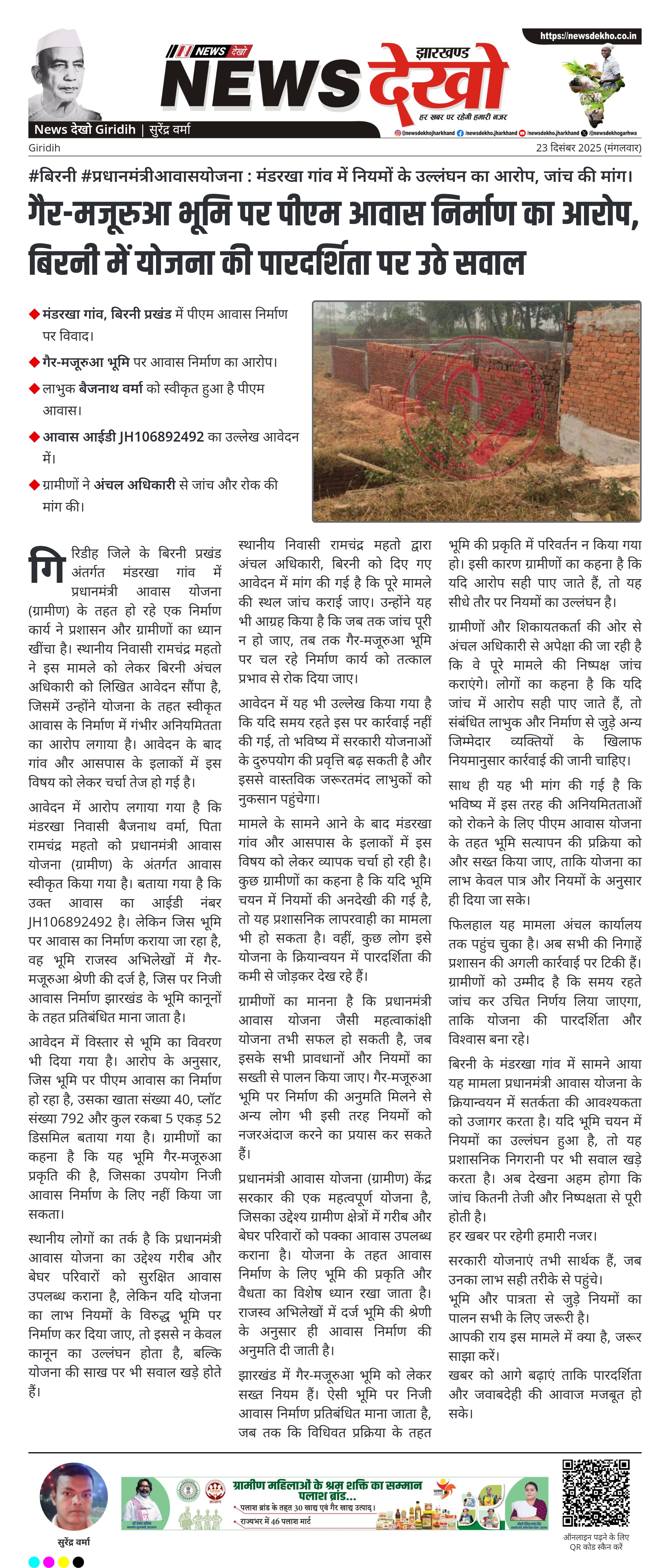 #बिरनी #प्रधानमंत्रीआवासयोजना : मंडरखा गांव में नियमों के उल्लंघन का आरोप, जांच की मांग। मंडरखा गांव, बिरनी प्रखंड में पीएम आवास निर्माण पर विवाद। गैर-मजूरुआ भूमि पर आवास निर्माण का आरोप। लाभुक बैजनाथ वर्मा को स्वीकृत हुआ है पीएम आवास। आवास आईडी JH106892492 का उल्लेख आवेदन में। ग्रामीणों ने अंचल अधिकारी से जांच और रोक की मांग की। गिरिडीह जिले के बिरनी प्रखंड अंतर्गत मंडरखा गांव में प्रधानमंत्री आवास योजना (ग्रामीण) के तहत हो रहे एक निर्माण कार्य ने प्रशासन…