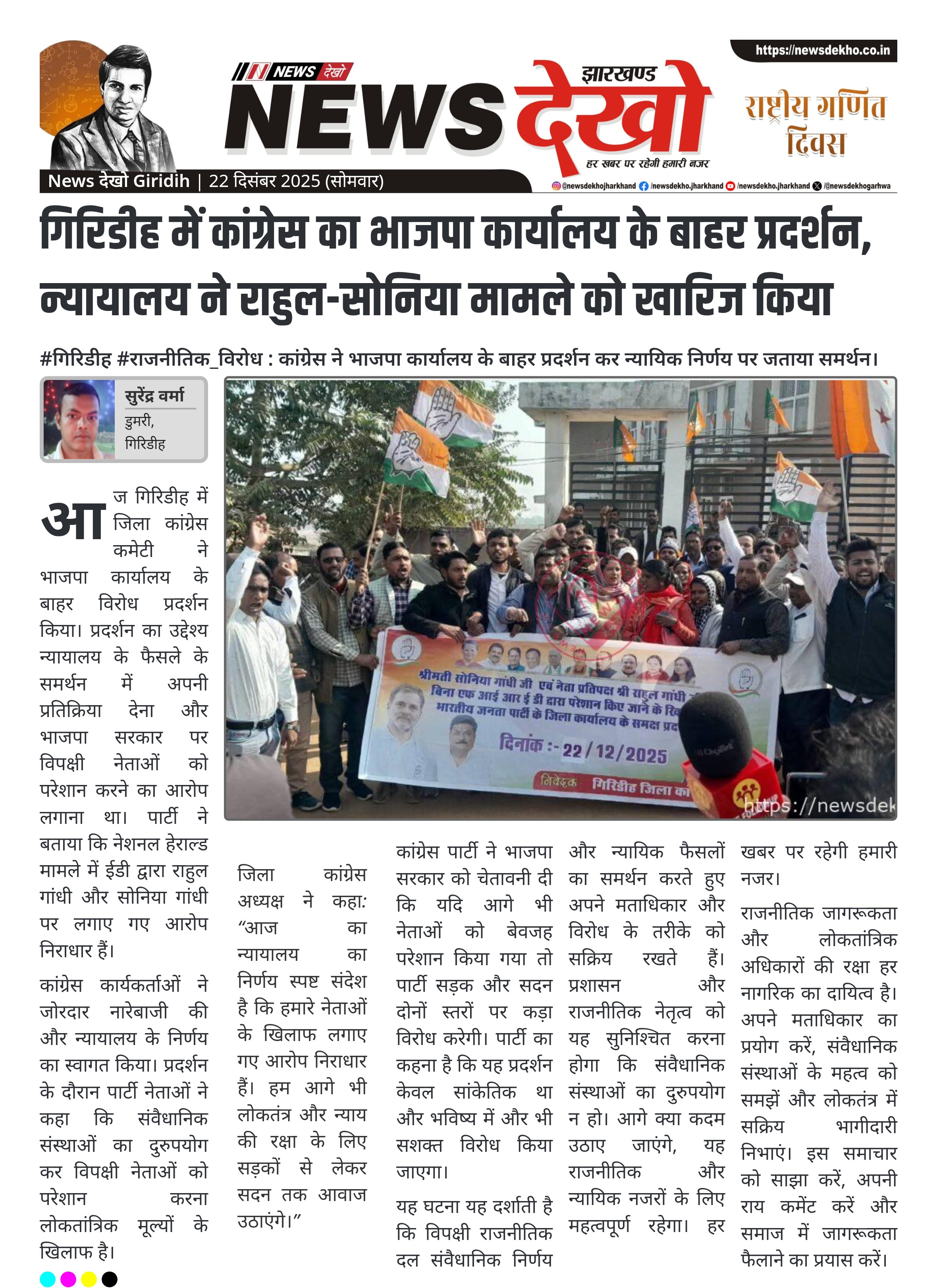 गिरिडीह में कांग्रेस का भाजपा कार्यालय के बाहर प्रदर्शन, न्यायालय ने राहुल-सोनिया मामले को खारिज किया