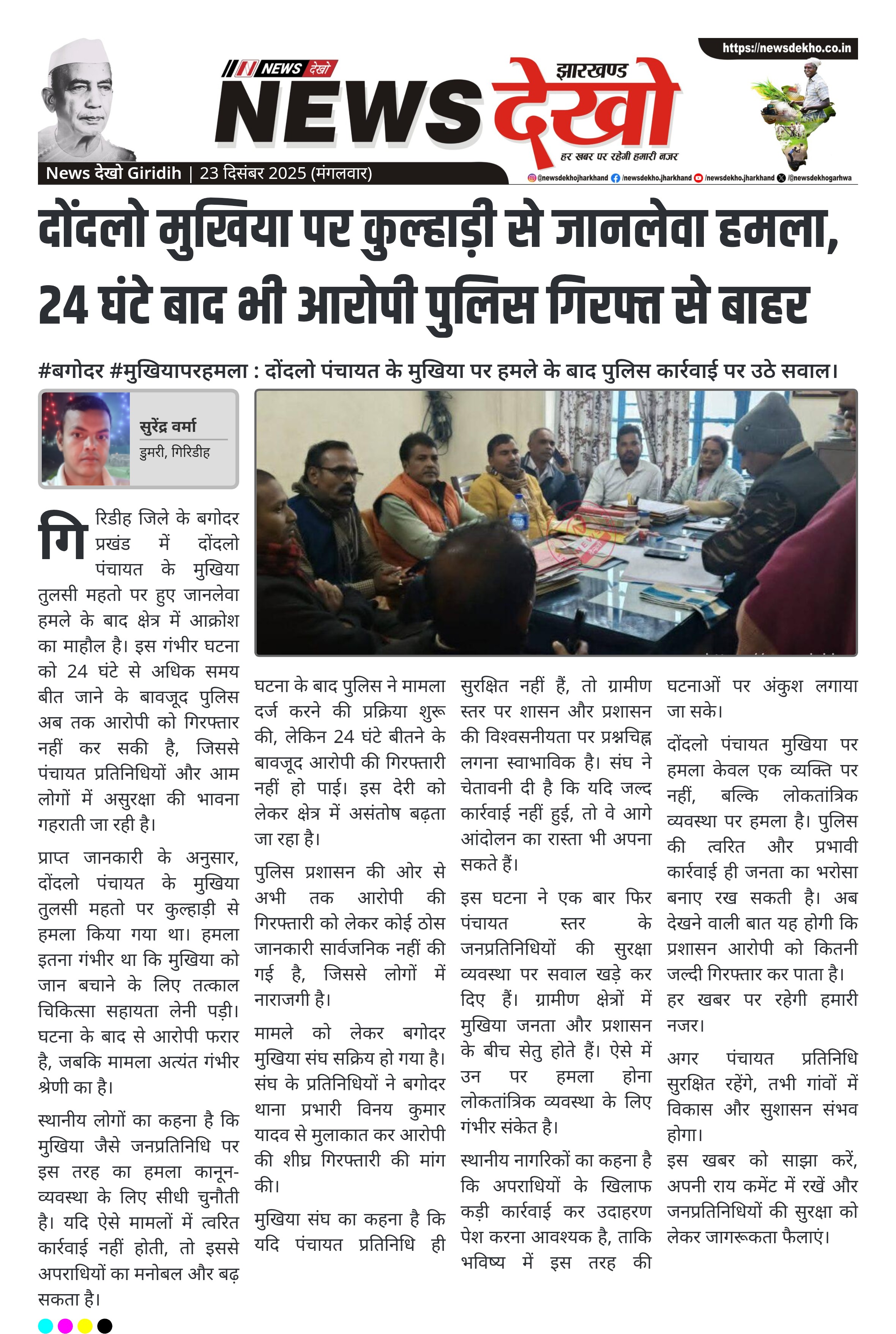 #बगोदर #मुखियापरहमला : दोंदलो पंचायत के मुखिया पर हमले के बाद पुलिस कार्रवाई पर उठे सवाल। दोंदलो पंचायत के मुखिया तुलसी महतो पर कुल्हाड़ी से जानलेवा हमला। घटना के 24 घंटे बाद भी आरोपी फरार। बगोदर मुखिया संघ ने पुलिस से की त्वरित कार्रवाई की मांग। थाना प्रभारी विनय कुमार यादव से प्रतिनिधिमंडल ने की मुलाकात। पंचायत प्रतिनिधियों की सुरक्षा पर उठे सवाल। गिरिडीह जिले के बगोदर प्रखंड में दोंदलो पंचायत के मुखिया तुलसी महतो पर हुए जानलेवा हमले के…