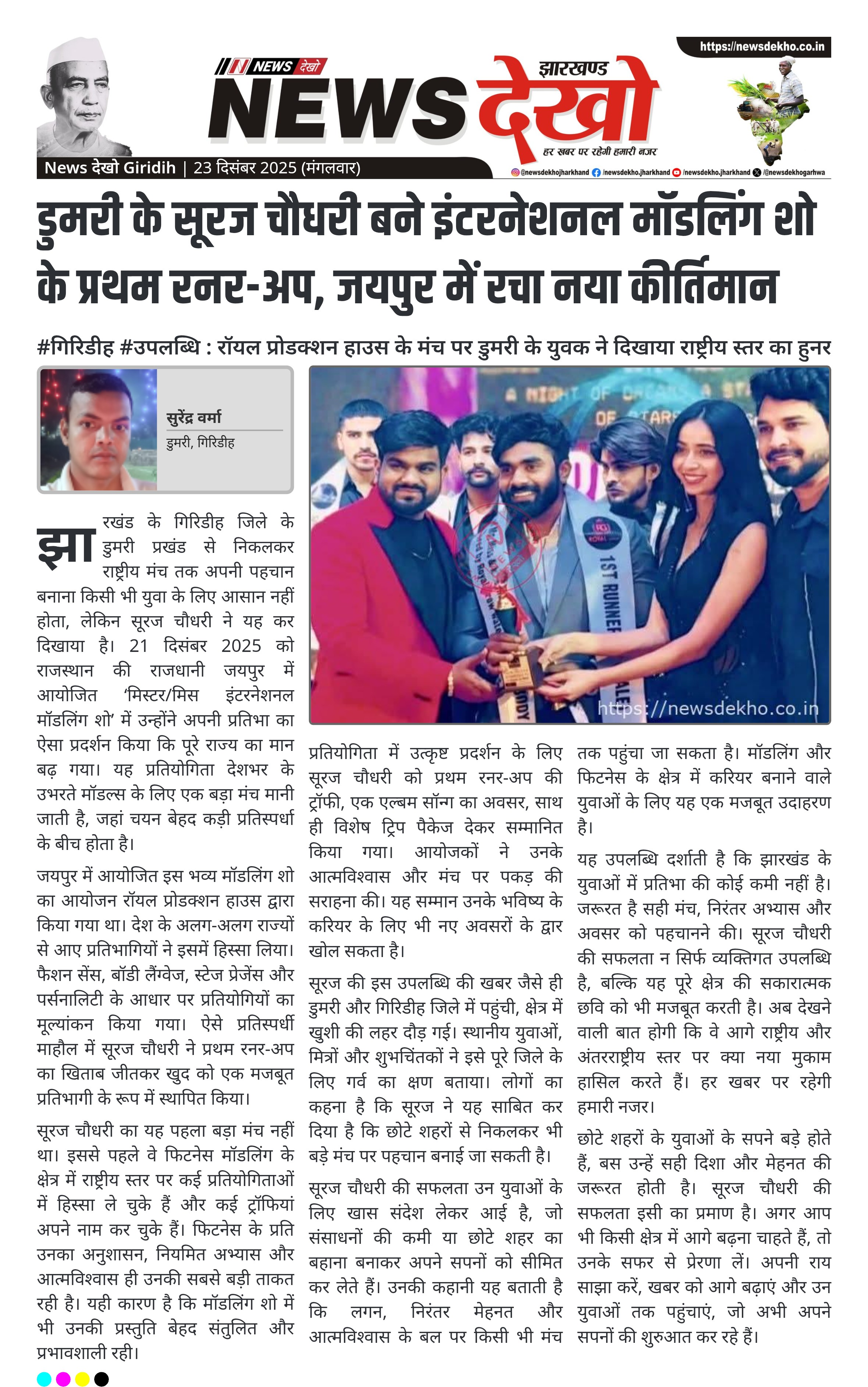 डुमरी के सूरज चौधरी बने इंटरनेशनल मॉडलिंग शो के प्रथम रनर-अप, जयपुर में रचा नया कीर्तिमान