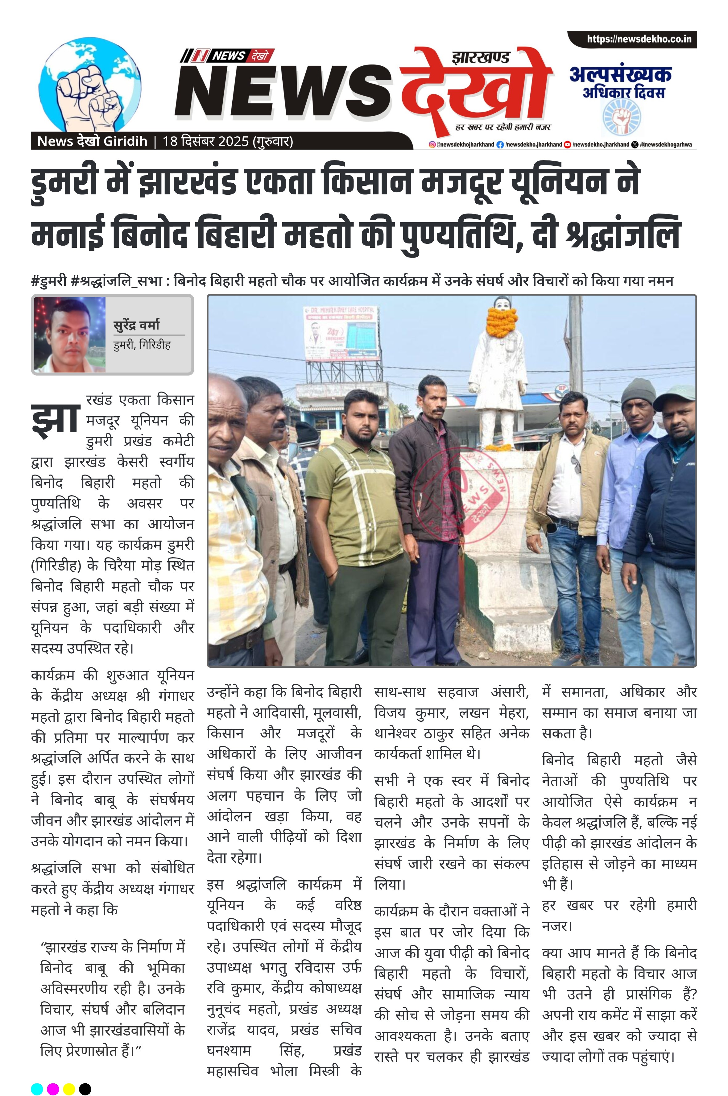 #डुमरी #श्रद्धांजलि_सभा : बिनोद बिहारी महतो चौक पर आयोजित कार्यक्रम में उनके संघर्ष और विचारों को किया गया नमन झारखंड एकता किसान मजदूर यूनियन डुमरी प्रखंड कमेटी द्वारा आयोजित हुई श्रद्धांजलि सभा। चिरैया मोड़ स्थित बिनोद बिहारी महतो चौक पर प्रतिमा पर किया गया माल्यार्पण। केंद्रीय अध्यक्ष गंगाधर महतो ने बिनोद बाबू के योगदान को बताया अविस्मरणीय। राज्य निर्माण आंदोलन में बिनोद बाबू की भूमिका को किया गया याद। यूनियन के केंद्रीय व प्रखंड स्तर के कई पदाधिकारी रहे उपस्थित।…