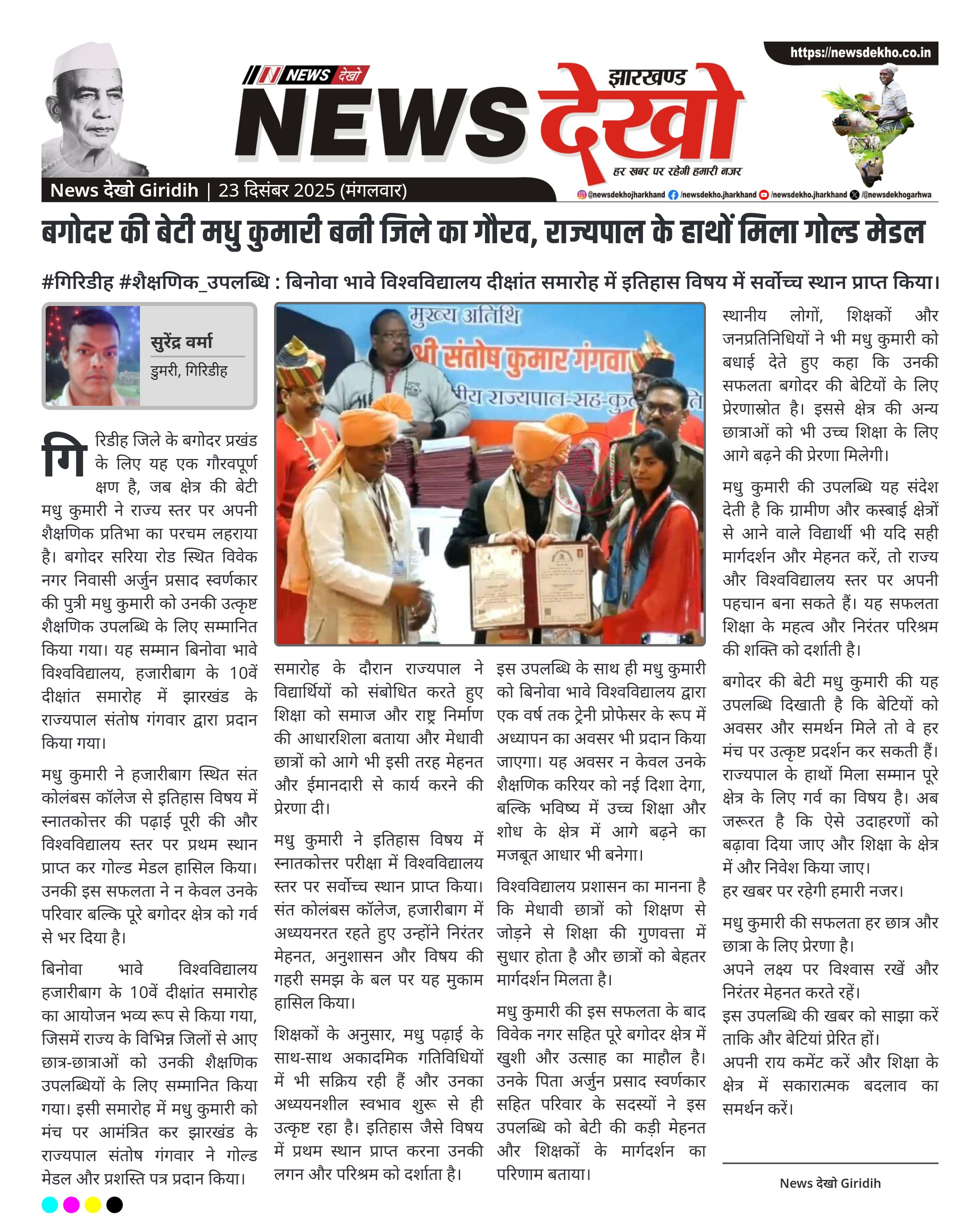 बगोदर की बेटी मधु कुमारी बनी जिले का गौरव, राज्यपाल के हाथों मिला गोल्ड मेडल